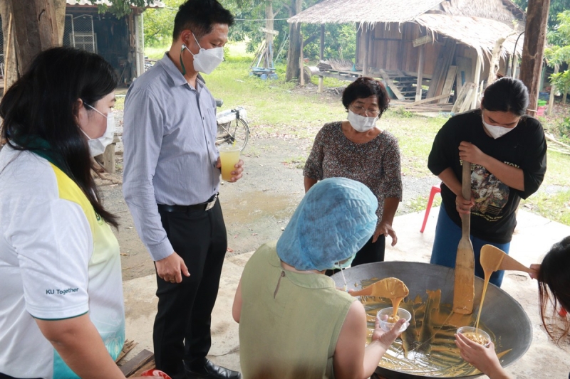 วันพุธที่ 7 กันยายน 2565 ผู้ช่วยศาสตราจารย์ ดร. ชัยสิทธิ์ ทองจู คณบดีคณะเกษตร กำแพงแสน ในนามประธานคลัสเตอร์ 18 เยี่ยมชมการดำเนินการอบรมเพื่อพัฒนาผลิตภัณฑ์ "น้ำตาลอ้อย" ให้กับประชาชนในพื้นที่ ภายใต้โครงการขับเคลื่อนเศรษฐกิจและสังคมฐานรากหลังโควิดด้วยเศรษฐกิจ BCG (U2T for BCG) มหาวิทยาลัยเกษตรศาสตร์ Cluster 18 ตำบลสวนป่าน อำเภอเมืองนครปฐม จังหวัดนครปฐม โดยภาควิชาปฐพีวิทยา คณะเกษตร กำแพงแสน รับผิดชอบโครงการ มี ผู้ช่วยศาสตราจารย์ ดร. นภาพร พันธุ์กมลศิลป์ เป็นประธานโครงการ ณ ศูนย์เรียนรู้ปรัชญาของเศรษฐกิจพอเพียงและเกษตรทฤษฎีใหม่ ประจำตำบลสวนป่าน อำเภอเมือง จังหวัดนครปฐม