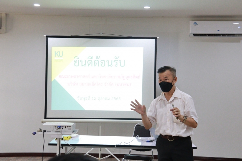 วันพุธที่ 12 ตุลาคม 2565 ผู้ช่วยศาสตราจารย์ ดร. ชัยสิทธิ์ ทองจู คณบดีคณะเกษตร กำแพงแสน รองศาสตราจารย์ ดร. ชัยณรงค์ รัตนกรีฑากุล รองคณบดีฝ่ายวิจัย บริการวิชาการและวิเทศสัมพันธ์ พร้อมด้วยบุคลากร ให้การต้อนรับ ทีมผู้บริหารและเจ้าหน้าที่ บริษัท สยามแม็คโคร จำกัด นำโดย คุณศิริพร เดชสิงห์ รองประธานเจ้าหน้าที่บริหารสายงานการสื่อสารองค์กร คุณจุฑารัตน์ พัฒนาทร ผู้อำนวยการ ฝ่ายประกันคุณภาพ ได้นำ ผู้บริหาร คณาจารย์ และเจ้าหน้าที่จากมหาวิทยาลัยราชภัฏอุตรดิตถ์ นำโดย อาจารย์ ชวลิต รักษาริกรณ์ คณบดีคณะเกษตรศาสตร์ ในการเข้าศึกษาดูงานการสร้างเครือข่ายเกษตรกรผลิตผักและผลไม้ มาตรฐาน GAP และมาตรฐาน Organic และโรงคัดบรรจุผักและผลไม้ คณะเกษตร กำแพงแสน ภายใต้โครงการพัฒนาโรงบรรจุพืชผัก และผลไม้ตามมาตรฐาน GMP เพื่อการพัฒนาผลผลิตทางการเกษตร สร้างรายได้ที่มั่นคงให้แก่ผู้ปลูกรายย่อยในจังหวัดอุตรดิตถ์ และจังหวัดใกล้เคียง ซึ่งเป็นความร่วมมือของบริษัท สยามแม็คโคร จำกัด กับ มหาวิทยาลัยราชภัฏอุตรดิตถ์