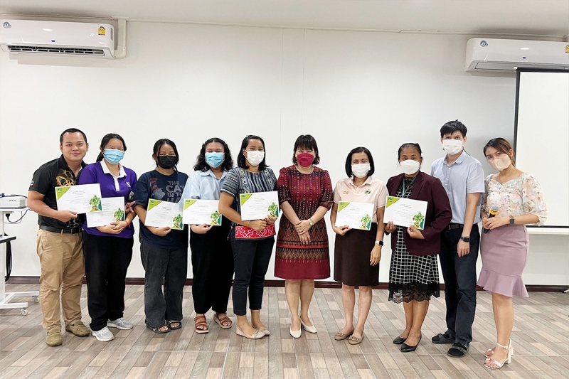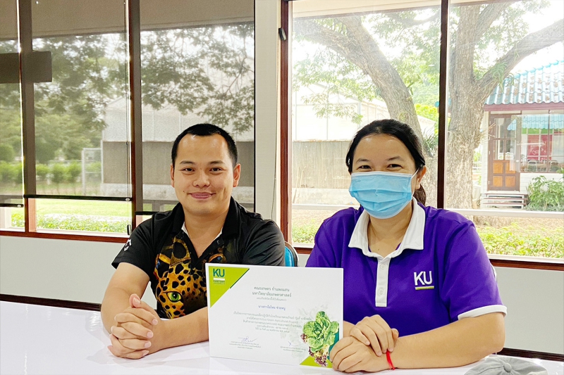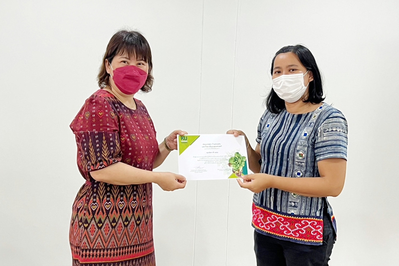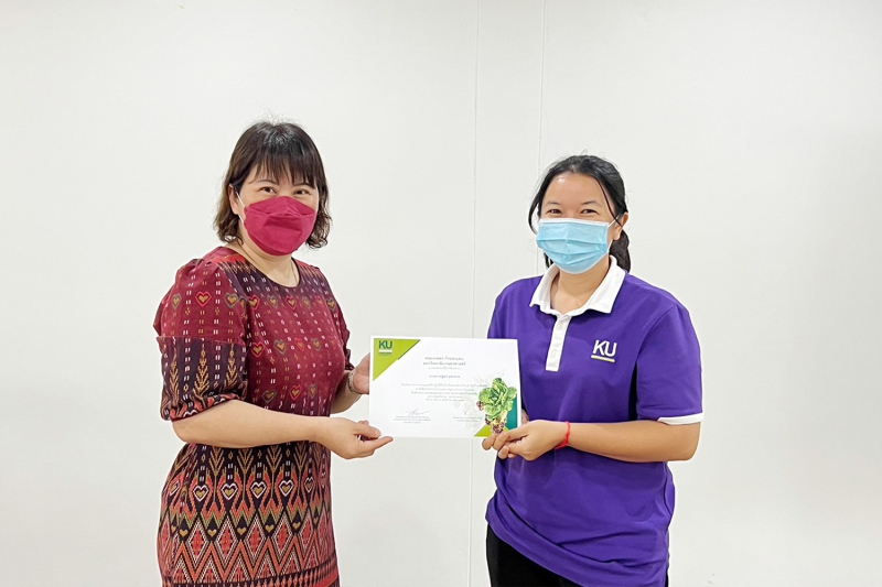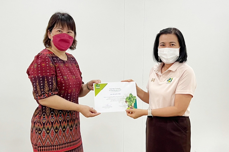 วันศุกร์ที่ 18 พฤศจิกายน 2565 ผู้ช่วยศาสตราจารย์ ดร. วนิดา สืบสายพรหม ผู้ช่วยคณบดีฝ่ายกิจการพิเศษ มอบใบประกาศนียบัตรให้แก่ ผู้เข้าร่วมกิจกรรม “โรงเรียนเกษตรอภิรมย์ รุ่นที่ 2-ผักสลัด” ภายใต้โครงการ Eco Green Agricultural Product สินค้าทางการเกษตรแบบครบวงจร คณะเกษตร กำแพงแสน ณ ห้องอบรมเรือนเกษตรอภิรมย์ คณะเกษตร กำแพงแสน ซึ่งดำเนินกิจกรรมในระหว่างเดือนสิงหาคม-ตุลาคม 2565 ให้แก่บุคลากร นิสิต มหาวิทยาลัยเกษตรศาสตร์ วิทยาเขตกำแพงแสน และผู้สนใจทั่วไป