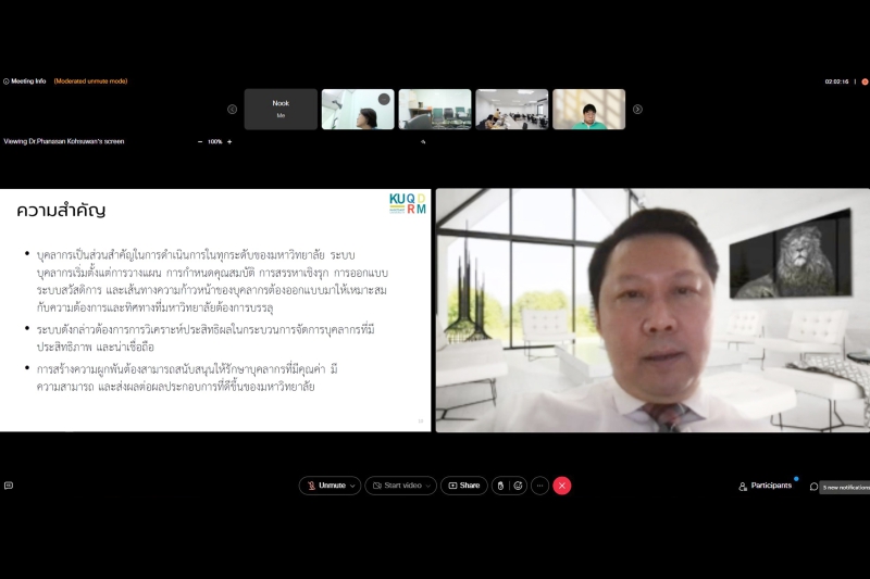 วันจันทร์ที่ 21 พฤศจิกายน 2565 ผู้ช่วยศาสตราจารย์ ดร. ชัยสิทธิ์ ทองจู พร้อมด้วยผู้บริหาร และหัวหน้างาน เข้าร่วมอบรม "การประเมินตนเอง (Self-Assessment: SA) รุ่นที่ 2" โดย รศ.รัชต์วรรณ กาญจนปัญญาคม ผู้ทรงคุณวุฒิ และที่ปรึกษาด้านการพัฒนาคุณภาพ มก. และทีมงาน เป็นวิทยากร ณ ห้องเสรี-สมพร ทรัพยสาร และในรูปแบบออนไลน์