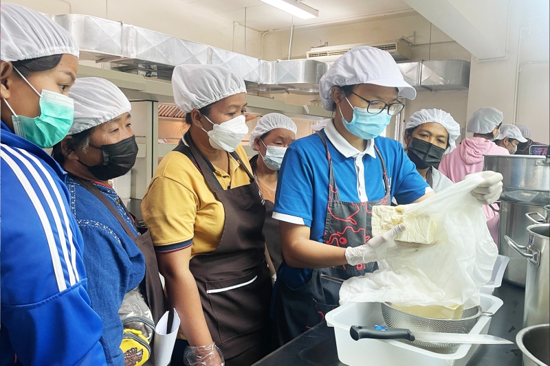 วันที่ 22 พฤศจิกายน 2565 โครงการจัดตั้งภาควิชานวัตกรรมอาหารปลอดภัย คณะเกษตร กำแพงแสน โดย ผู้ช่วยศาสตราจารย์ ดร. ศศิธร นาคทอง และบุคลากร ดำเนินการ "ฝึกอบรมการแปรรูปผลิตภัณฑ์" ให้แก่เกษตรกรผู้เลี้ยงโคนม จังหวัดนครปฐม จำนวน 10 ราย จากโครงการพัฒนาเกษตรกรปราดเปรื่อง Smart Farmer ประจำปีงบประมาณ 2566 ของสำนักงานปศุสัตว์จังหวัดนครปฐม ณ กลุ่มอาคารแปรูปสินค้าเกษตรและอาหาร โครงการจัดตั้งภาควิชานวัตกรรมอาหารปลอดภัย คณะเกษตร กำแพงแสน