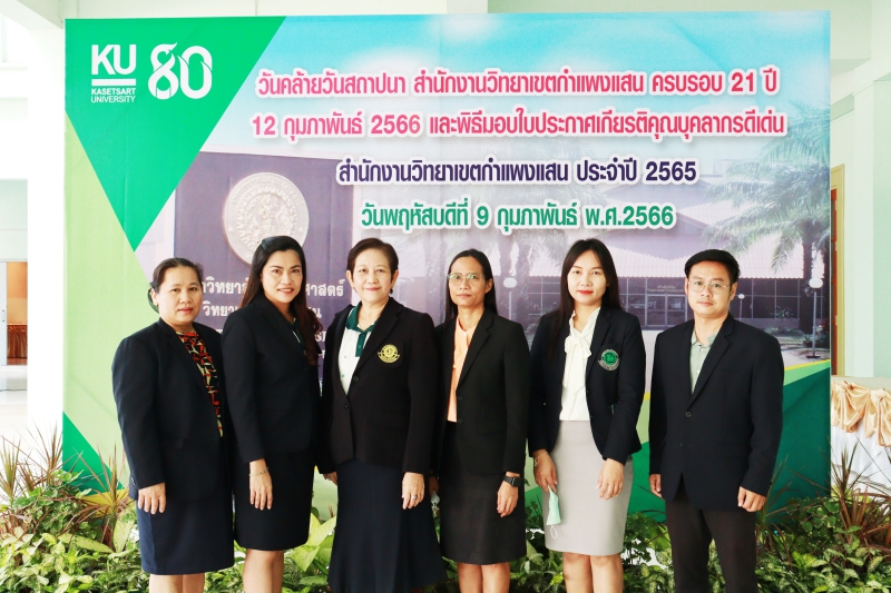 วันพฤหัสบดีที่ 9 กุมภาพันธ์ 2566 ผู้ช่วยศาสตราจารย์ ดร. ชัยสิทธิ์ ทองจู คณบดีคณะเกษตร กำแพงแสน พร้อมด้วย ผู้บริหาร และบุคลากรคณะเกษตร กำแพงแสน ร่วมแสดงความยินดีกับ นายอุกฤษฏ์ มนูจันทรัถ ผู้อำนวยการสำนักงานวิทยาเขตกำแพงแสน เนื่องในโอกาส วันคล้ายวันสถาปนา สำนักงานวิทยาเขตกำแพงแสน ครบรอบ 21 ปี ในวันที่ 12 กุมภาพันธ์ 2566 ณ อาคารศูนย์มหาวิทยาลัยเกษตรศาสตร์ วิทยาเขตกำแพงแสน