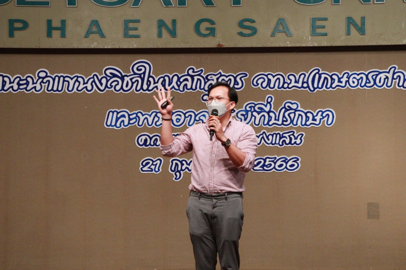คณะเกษตร กำแพงแสน จัด "กิจกรรมแนะนำหลักสูตรและพบอาจารย์ที่ปรึกษา" เพื่อให้นิสิตในหลักสูตร วท.บ. เกษตรศาสตร์ ได้มีข้อมูลในการตัดสินใจเลือกแขนงวิชา นิสิตชั้นปีที่ 1 ทั้ง 4 หลักสูตรได้พบปะ ปรึกษา และสร้างความคุ้นเคยกับอาจารย์ที่ปรึกษา โดย ผู้ช่วยศาสตราจารย์ ดร. ชัยสิทธิ์ ทองจู คณบดีคณะเกษตร กำแพงแสน กล่าวเปิดโครงการ มีการแนะนำกำหนดการ เกณฑ์การเลือกแขนงวิชาเอกและการย้ายหลักสูตร โดยรองคณบดีฝ่ายการศึกษาและประกันคุณภาพ และประธานอาจารย์ผู้รับผิดชอบหลักสูตร วท.บ. เกษตรศาสตร์ การแนะนำแขนงวิชาต่างๆ 6 แขนงวิชาโดยหัวหน้าภาควิชาหรือผู้แทน หลังจากนั้นเป็นกิจกรรมการพบอาจารย์ที่ปรึกษาและรับประทานอาหารร่วมกันของนิสิตชั้นปีที่ 1 ทั้ง 4 หลักสูตร จัดเมื่อวันอังคารที่ 21 กุมภาพันธ์ 2566 ณ ห้องคอนเวนชั่น อาคารศูนย์มหาวิทยาลัยเกษตรศาสตร์ วิทยาเขตกำแพงแสน