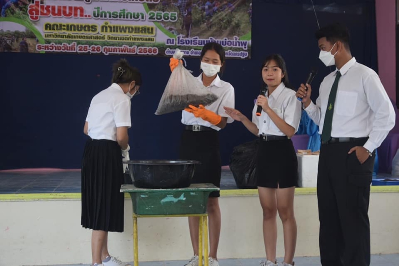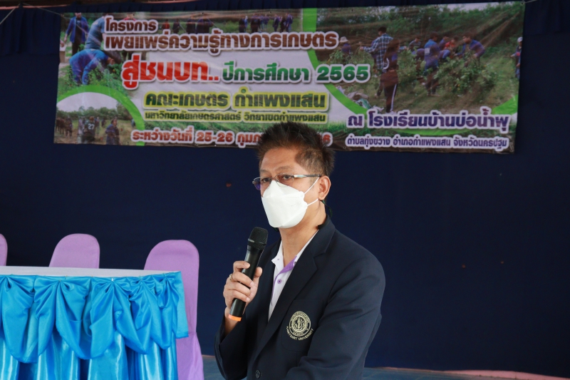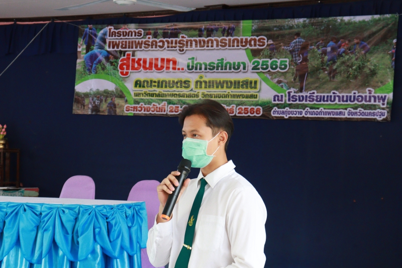 วันเสาร์ที่ 25 กุมภาพันธ์ 2566 ผู้ช่วยศาสตราจารย์ ดร. ชัยสิทธิ์ ทองจู คณบดีคณะเกษตร กำแพงแสน เป็นประธานกล่าวเปิด โครงการส่งเสริมคุณภาพนิสิตและชุมชนสัมพันธ์ กิจกรรม "เผยแพร่ความรู้ทางการเกษตรสู่ชุมชน" โดย นายกฤษฎา พึ่งทองดี นิสิตภาควิชาปฐพีวิทยา ชั้นปีที่ 4 ประธานโครงการ กล่าวรายงาน ณ โรงเรียนบ้านบ่อน้ำพุ ต.ทุ่งขวาง อ.กำแพงแสน จ.นครปฐม ดำเนินกิจกรรมในระหว่างวันที่ 25-26 กุมภาพันธ์ 2566 โดย นิสิตคณะเกษตร กำแพงแสน จำนวน 200 คน ที่เข้าร่วมโครงการ ได้เผยแพร่ความรู้ด้านการเกษตร พัฒนาแปลงผักสวนครัว วางระบบน้ำในแปลง และปั้มน้ำ และปรับภูมิทัศน์โดยรอบอาคารเก๋บอุปกรณ์และแปลงเกษตร ให้แก่โรงเรียน