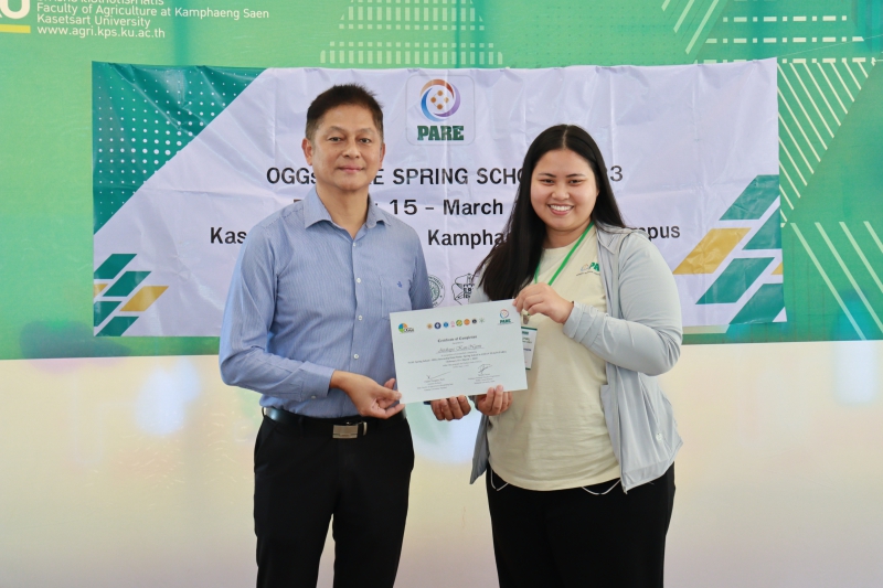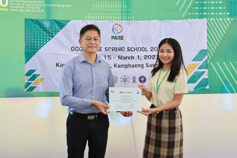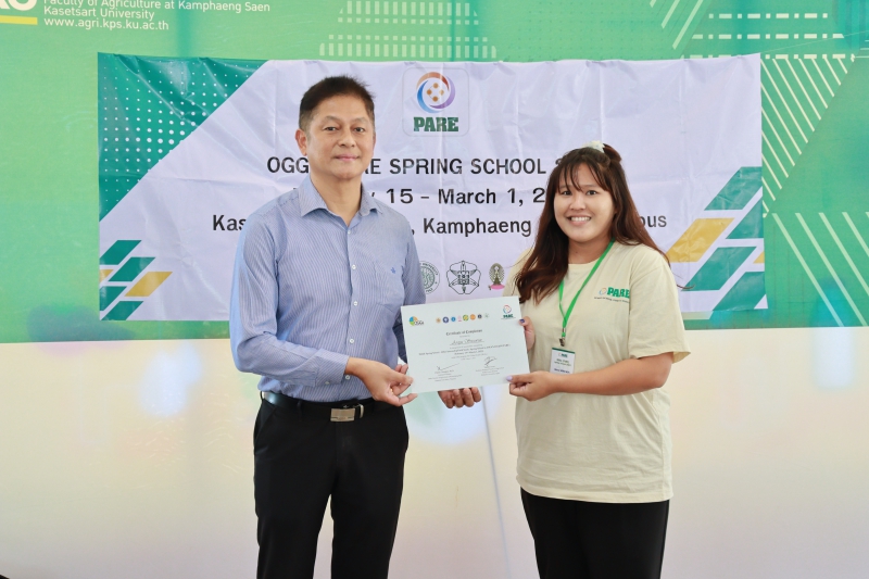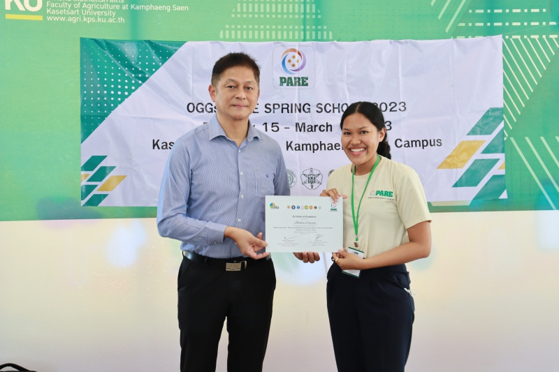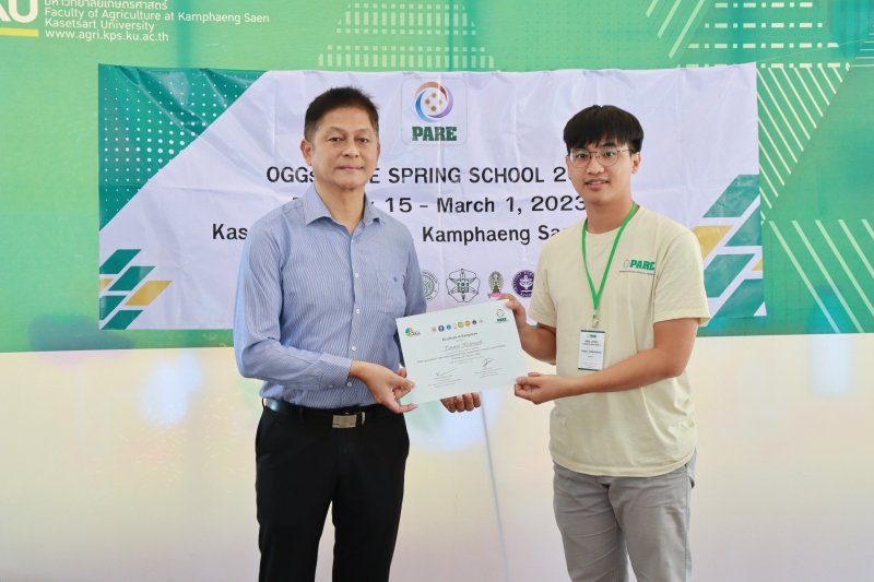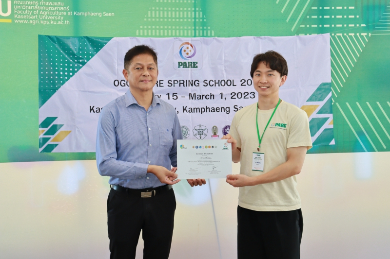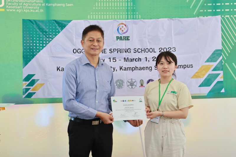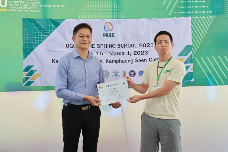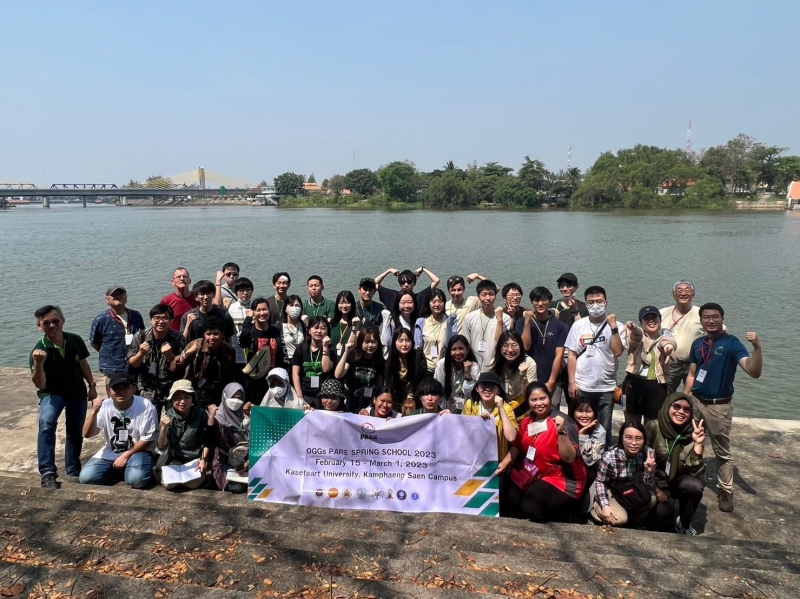 มหาวิทยาลัยเกษตรศาสตร์ โดย คณะเกษตร กำแพงแสน เป็นเจ้าภาพในการดำเนินโครงการ “OGGs PARE SPRING SCHOOL 2023” นำนิสิตในโครงการเข้าศึกษาดูงานภายใต้แนวคิดทางด้าน Populations-Activities - Resources – Environment Chain (PARE) ด้วยการลงพื้นที่สำรวจลุ่มน้ำแม่กลอง ในจังหวัดกาญจนบุรี ราชบุรี และสมุทรสงคราม ตลอดจนการศึกษาเรียนรู้ชุมชนโดยรอบ เพื่อนำเสนอผลงานที่ได้รับจากการศึกษาดูงาน ในระหว่างวันที่ 15 กุมภาพันธ์ - 1 มีนาคม 2566 ทั้งนี้ ได้รับเกียรติจาก ผู้ช่วยศาสตราจารย์ ดร.ชัยสิทธิ์ ทองจู คณบดีคณะเกษตร กำแพงแสน มอบประกาศนียบัตรให้แก่นิสิตที่ร่วมโครงการฯ จำนวนทั้งสิ้น 38 คน จาก Hokkaido University ประเทศญี่ปุ่น Gadjah Mada University, IPB University ประเทศอินโดนีเซีย มหาวิทยาลัยเกษตรศาสตร์ และจุฬาลงกรณ์มหาวิทยาลัย ณ มหาวิทยาลัยเกษตรศาสตร์ วิทยาเขตกำแพงแสน