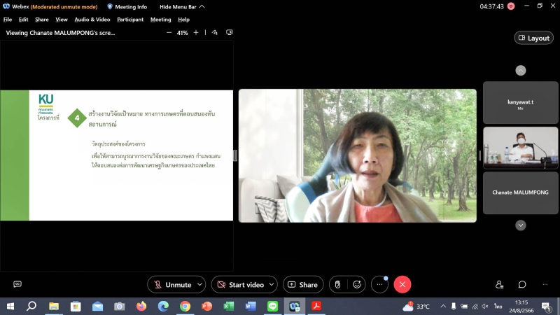 วันพฤหัสบดีที่ 24 สิงหาคม 2566 ผู้ช่วยศาสตราจารย์ ดร. ชัยสิทธิ์ ทองจู คณบดีคณะเกษตร กำแพงแสน พร้อมด้วยผู้บริหาร และบุคลากร ร่วมรับฟัง "การให้คำปรึกษา ครั้งที่ 4 โครงการก้าวหน้าสู่ความเป็นเลิศ มหาวิทยาลัยเกษตรศาสตร์ (KU GROW-66) กลุ่มก้าวหน้า" เพื่อรายงานความก้าวหน้าแผนพัฒนาปรับปรุง โดย ศ.พญ.ดวงมณี เลาหประสิทธิพร ผู้ทรงคุณวุฒิ คณะแพทยศาสตร์ศิริราชพยาบาล ที่ปรึกษาภายนอก พร้อมคณะที่ปรึกษา สำนักงานประกันคุณภาพ ในรูปแบบออนไลน์ ณ ห้องประชุมเสรี-สมพร ทรัพยสาร คณะเกษตร กำแพงแสน