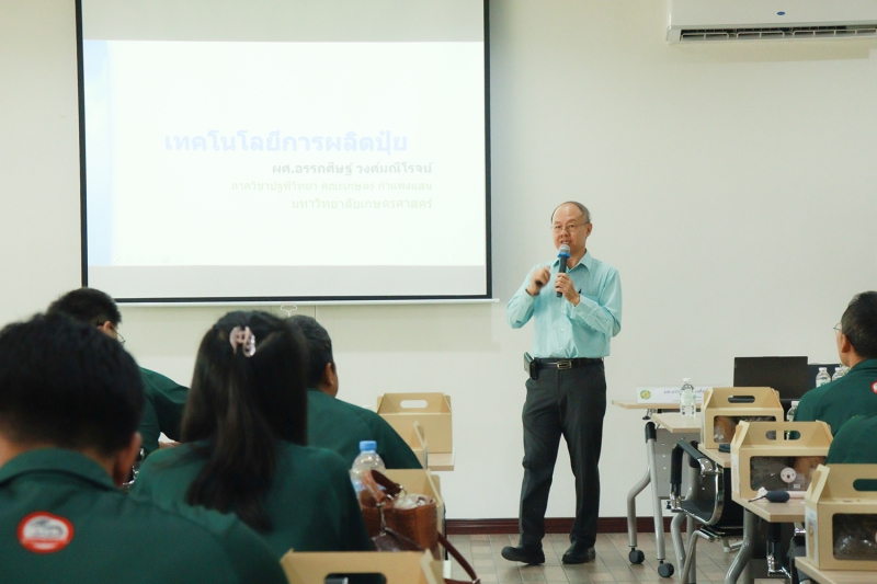 วันพุธที่ 8 พฤศจิกายน 2566 ผู้ช่วยศาสตราจารย์ ดร. ชัยสิทธิ์ ทองจู คณบดีคณะเกษตร กำแพงแสน กล่าวเปิดการอบรม เรื่อง “เทคโนโลยีการผลิตปุ๋ยและทิศทางการใช้ปุ๋ยในอนาคต” ซึ่งจัดโดย ภาควิชาปฐพีวิทยา คณะเกษตร กำแพงแสน ให้กับผู้บริหารและพนักงาน บริษัท เจียไต๋ จำกัด จำนวน 50 คน โดยมีการอบรมในระหว่างวันที่ 8-9 พฤศจิกายน 2566 ณ ห้องฝึกอบรม อาคารบริการวิชาการ คณะเกษตร กำแพงแสน เพื่อเพิ่มพูนความรู้ความเข้าใจเกี่ยวกับเทคโนโลยีการผลิตปุ๋ยและสามารถวิเคราะห์แนวโน้มการใช้ปุ๋ยในอนาคตได้อย่างถูกต้อง และส่งเสริมให้พนักงานได้พัฒนาทักษะในวิชาชีพให้มีประสิทธิภาพยิ่งขึ้น