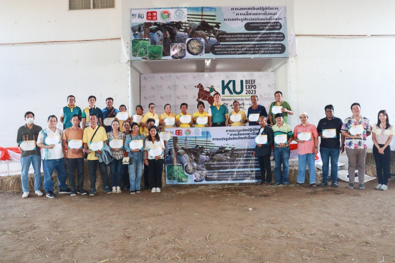 วันที่ 6 ธันวาคม 2566 ภาควิชาสัตวบาล คณะเกษตร กำแพงแสน จัดการอบรมเชิงปฏิบัติการ “การเลี้ยงแพะเนื้อและการแปรรูปผลิตภัณฑ์เนื้อแพะ” ให้แก่เกษตรกร และผู้สนใจ จำนวน 27 คน ภายใต้โครงการ Improving smallholder goat fattening systems based on tropical grass and forage tree legume diets in the countries of R12 route (Thailand, Lao PDR, and Vietnam) ได้รับเกียรติจาก ผู้ช่วยศาสตราจารย์ ดร. ชัยสิทธิ์ ทองจู คณบดีคณะเกษตร กำแพงแสน มอบประกาศนียบัตรแก่ผู้ผ่านการอบรม ณ ภาควิชาสัตวบาล (ศูนย์สาธิตการผลิตโคเนื้อครบวงจร) คณะเกษตร กำแพงแสน มหาวิทยาลัยเกษตรศาสตร์