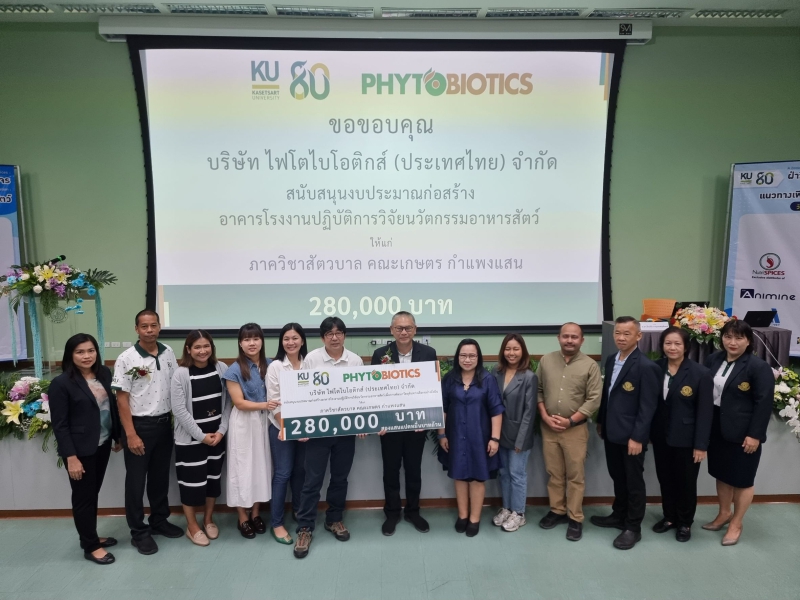 ในโอกาสนี้ รองศาสตราจารย์ ดร. ยุวเรศ เรืองพานิช รายงานการดำเนินงานของอาคารโรงงานปฏิบัติการวิจัยนวัตกรรมอาหารสัตว์ ซึ่งได้รับทุนสนับสนุนงบประมาณการก่อสร้างจาก บริษัท ไฟโตไบโอติกส์ (ประเทศไทย) จำกัด เป็นจำนวนเงิน 280,000 บาท โดย รองอธิการบดีวิทยเขตกำแพงแสน พร้อมผู้บริหารและคณาจารย์ภาควิชาสัตวบาล คณะเกษตร กำแพงแสน ร่วมรับมอบ