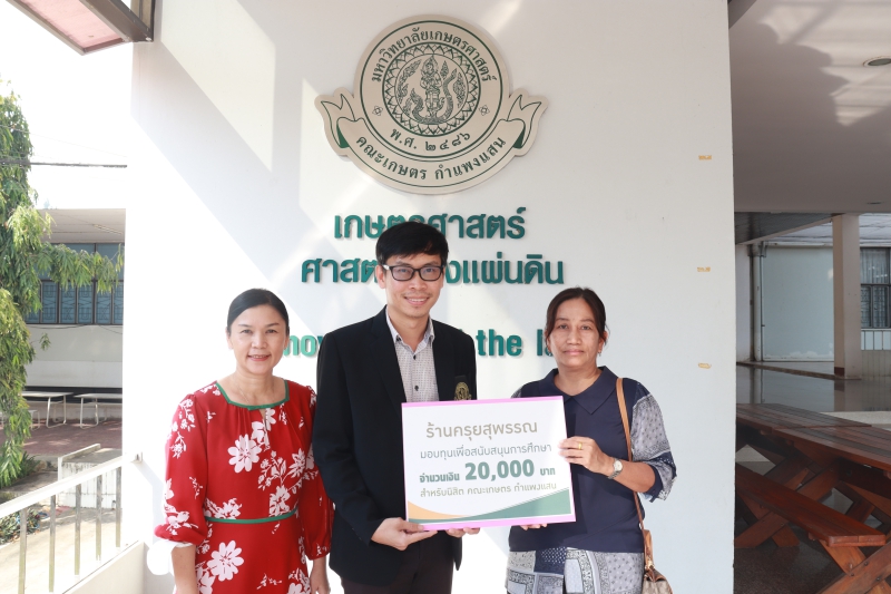 วันพฤหัสบดีที่ 18 มกราคม 2567 ผู้ช่วยศาสตราจารย์ ดร.ธวัชชัย อินทร์บุญช่วย รองคณบดีฝ่ายพัฒนานิสิต รับมอบทุนเพื่อสนับสนุนการศึกษา จากคุณศศิมา ละอองนวล ร้านครุยสุพรรณ จำนวน 20,000 บาท ณ คณะเกษตร กำแพงแสน