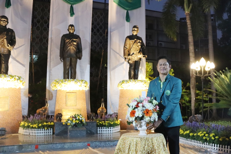 วันพฤหัสบดีที่ 2 กุมภาพันธ์ 2567 ผู้ช่วยศาสตราจารย์ ดร. ชัยสิทธิ์ ทองจู คณบดีคณะเกษตร กำแพงแสน พร้อมด้วยผู้บริหาร คณาจารย์ และนิสิต ร่วมงาน “วันครบรอบ 81 ปี วันสถาปนา มหาวิทยาลัยเกษตรศาสตร์” โดยวางแจกันดอกไม้ เบื้องหน้าอนุสาวรีย์สามบูรพาจารย์ ผู้มีคุณูปการ และบุกเบิกวางรากฐานการเกษตร และการศึกษาด้านการเกษตรของประเทศไทยและของมหาวิทยาลัยเกษตรศาสตร์ ร่วมกับทีมผู้บริหาร วิทยาเขตกำแพงแสน และนายมนตรี ตั้งไมตรีจิต นายกสมาคมนิสิตเก่าคณะเกษตร กำแพงแสน จากนั้น ร่วมทำบุญตักบาตรพระสงฆ์ ณ อนุสาวรีย์สามบูรพาจารย์ และหอประชุมใหญ่ มหาวิทยาลัยเกษตรศาสตร์ บางเขน