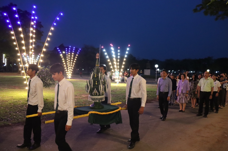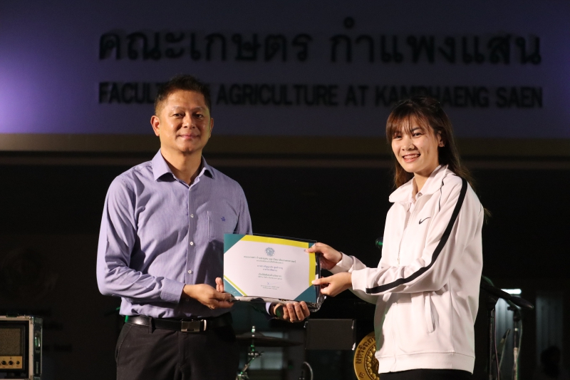 ผู้ช่วยศาสตราจารย์ ดร. ชัยสิทธิ์ ทองจู คณบดีคณะเกษตร กำแพงแสน กล่าวแสดงความยินดีและให้ปัจฉิมโอวาท แก่นิสิตชั้นปีที่ 4 (รหัส 63) ที่กำลังจะสำเร็จการศึกษา คุณเสาวลักษณ์ สวัสดิ์กว้าน (กีฏวิทยา KU49) ผู้แทนจากสมาคมนิสิตเก่าคณะเกษตร กำแพงแสน กล่าวแสดงความยินดี พิธีมอบเกียรติบัตรนิสิตดีเด่น "ด้านจิตอาสา" โดยคณบดีคณะเกษตร กำแพงแสน จากนั้น เข้าสู่ พิธีบายศรีสู่ขวัญและผูกข้อมือ นิสิตชั้นปีที่ 4