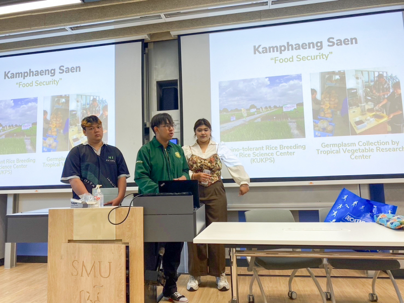 - Singapore Management University (SMU) เพื่อรับฟัง campus tour จากตัวแทนนิสิตและเข้ารับการแลกเปลี่ยนนโยบายกับกลุ่มผู้นำนิสิตของ SMU ทั้งในเรื่องการจัดกิจกรรมและการจัดการสุขภาวะของนิสิต โดยมหาวิทยาลัยเกษตรศาสตร์ได้นำเสนอในส่วนของ จุดเด่นของทั้ง 4 วิทยาเขต และการใช้ความรู้เพื่อบริการและคืนประโยชน์สู่สังคม (ศาสตร์แห่งแผ่นดิน) โดยวิทยาเขตกำแพงแสนนำเสนอในส่วนของจุดเด่นด้านการเกษตร และการวิจัยทางการเกษตรเพื่อส่งเสริมความยั่งยืนและมั่นคงทางด้านอาหาร