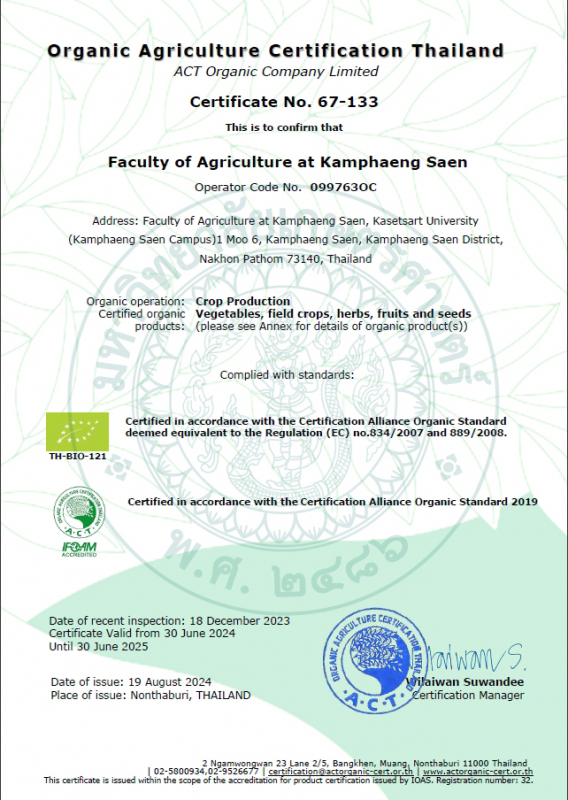 วันที่ 27 สิงหาคม 2567 รองศาสตราจารย์ ดร.ชัยณรงค์ รัตนกรีฑากุล รองคณบดีฝ่ายบริหาร คณะเกษตร กำแพงแสน พร้อมด้วยบุคลากร ศูนย์วิจัยและบริการวิชาการให้การต้อนรับ เจ้าหน้าที่จาก สำนักงานมาตรฐานเกษตรอินทรีย์ (มกท.) ในการเข้าตรวจประเมินแปลงตามมาตรฐานเกษตรอินทรีย์ EU และ IFOAM จำนวน 3 พื้นที่ แปลงที่ 1 A 14 จำนวน 4 ไร่ แปลงที่ 2 A6 จำนวน 1 ไร่ และโรงเรือน 1 จำนวน 0.48 ไร่ ของคณะเกษตร กำแพงแสน เกณฑ์ประเมินผ่านตามมาตรฐานที่กำหนด ณ แปลงปลูกพืชอินทรีย์ ศูนย์วิจัยและบริการวิชาการ คณะเกษตร กำแพงแสน