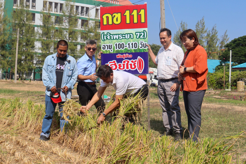 เก็บเกี่ยวข้าว กข 111-เจ้าพระยา 72 ในแปลงผลิตเมล็ดพันธุ์ข้าวแบบเปียกสลับแห้ง