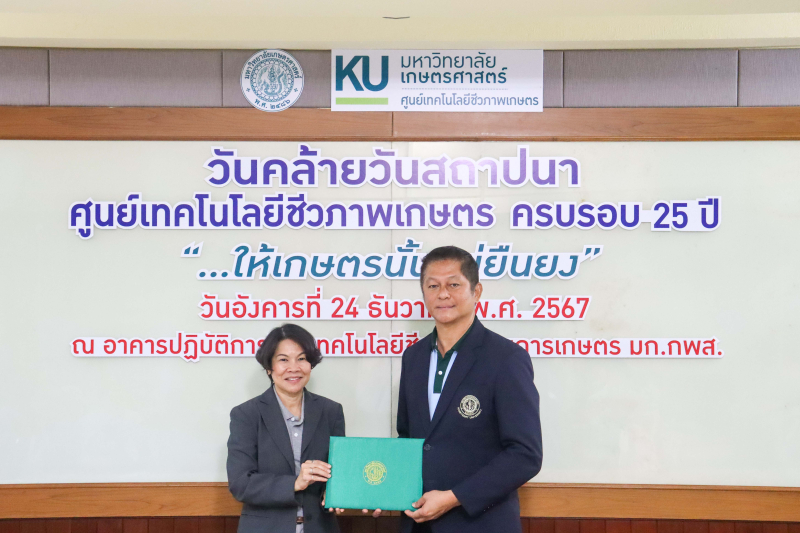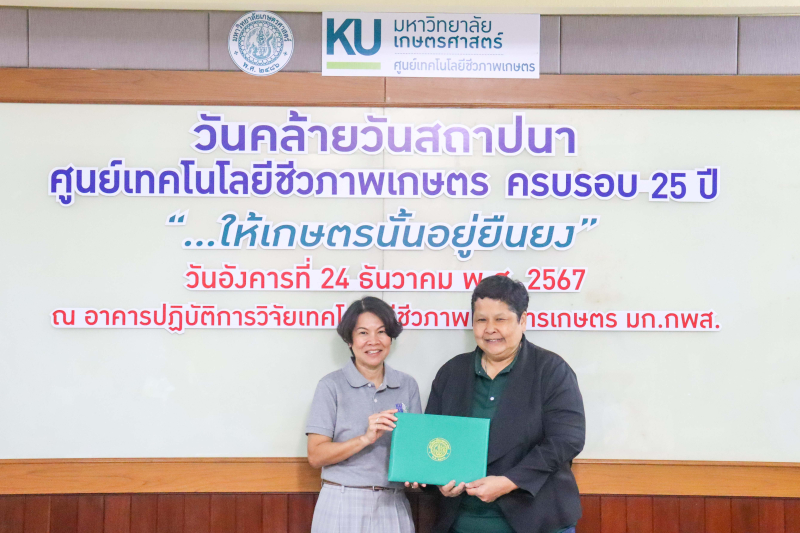 วันอังคารที่ 24 ธันวาคม พ.ศ. 2567 ผู้ช่วยศาสตราจารย์ ดร.ชัยสิทธิ์ ทองจู คณบดีคณะเกษตร กำแพงแสน พร้อมด้วยผู้บริหารและคณาจารย์ ร่วมแสดงความยินดีกับ ดร. อรอุบล ชมเดช ผู้อำนวยการศูนย์เทคโนโลยีชีวภาพเกษตร เนื่องในวันคล้ายวันสถาปนาศูนย์เทคโนโลยีชีวภาพเกษตร ครบรอบ 25 ปี ในโอกาสนี้ คณบดีคณะเกษตร กำแพงแสน ได้รับมอบประกาศเกียรติคุณหน่วยงานผู้มีคุณูปการต่อศูนย์เทคโนโลยีชีวภาพเกษตร ณ ห้อง A420 ชั้น 4 อาคารปฏิบัติการวิจัยเทคโนโลยีชีวภาพทางการเกษตร มก.กพส.