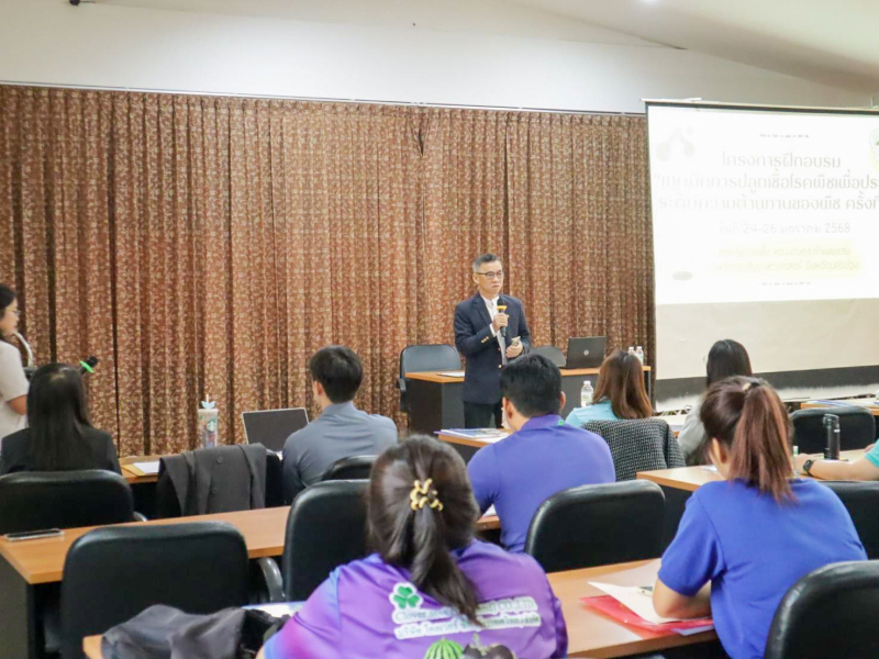 ภาควิชาโรคพืช คณะเกษตร กำแพงแสน ร่วมกับสมาคมนักโรคพืชแห่งประเทศไทย จัดโครงการฝึกอบรมเชิงปฏิบัติการ เรื่อง “เทคนิคการปลูกเชื้อโรคเพื่อประเมินระดับความต้านทานของพืช ครั้งที่ 2 ระหว่างวันที่ 24-26 มกราคม พ.ศ. 2568 ณ ภาควิชาโรคพืช คณะเกษตร กำแพงแสน มหาวิทยาลัยเกษตรศาสตร์ วิทยาเขตกำแพงแสน โดย ผู้ช่วยศาสตราจารย์ ดร.ศิริพร ดอนเหนือ หัวหน้าภาควิชาโรคพืช กล่าวรายงานวัตถุประสงค์การจัดโครงการอบรม และ ผู้ช่วยศาสตราจารย์ ดร.ชัยสิทธิ์ ทองจู คณบดีคณะเกษตร กำแพงแสน เป็นประธานในพิธีเปิดการอบรม โดยมี รองศาสตราจารย์ ดร.ชัยณรงค์ รัตนกรีฑากุล อุปนายกสมาคมนักโรคพืชแห่งประเทศไทย กล่าวต้อนรับผู้เข้าร่วมอบรม ในการอบรมครั้งนี้มีผู้เข้าอบรมภาคบรรยายและปฏิบัติรวม 28 คน ซึ่งเป็นนักวิชาการจากภาคเอกชน บริษัทเมล็ดพันธุ์ และหน่วยงานภาครัฐ ในภาคบรรยาย มีเนื้อหาเกี่ยวกับโรคพืชที่เกิดจากเชื้อไวรอยด์ ไวรัส แบคทีเรีย ไฟโตพลาสมา เชื้อรา และไส้เดือนฝอย และการประเมินความต้านทานในพืชเศรษฐกิจเพื่อการปรับปรุงพันธุ์ สำหรับภาคปฏิบัติฝึกทักษะเฉพาะทางการปลูกเชื้อสาเหตุโรคชนิดต่างๆ และการประเมินระดับความต้านทานของพืช โดยมี รองศาสตราจารย์ ดร.จินตนา อันอาตม์งาม เป็นหัวหน้าโครงการฝึกอบรม และมีผู้ทรงคุณวุฒิของภาควิชาฯ และคณาจารย์ เป็นวิทยากร นอกจากนี้ นิสิตระดับบัณฑิตศึกษา และนิสิตระดับปริญญาตรีได้เป็นผู้ช่วยการฝึกอบรมครั้งนี้ด้วย
