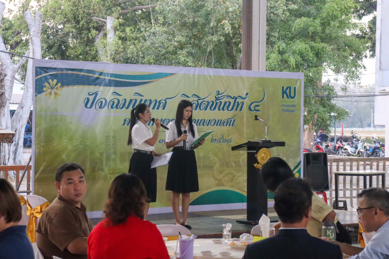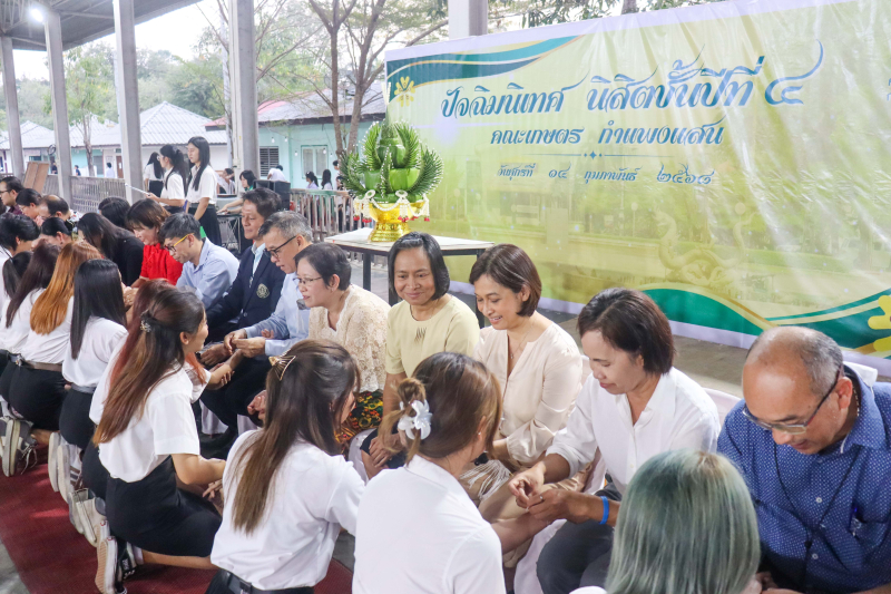 คณะเกษตร กำแพงแสน จัดกิจกรรม "ปัจฉิมนิเทศ นิสิตชั้นปีที่ 4 (รหัส 64)" ได้รับเกียรติจาก ผู้ช่วยศาสตราจารย์ ดร.ชัยสิทธิ์ ทองจู คณบดีคณะเกษตร กำแพงแสน กล่าวแสดงความยินดีและให้ปัจฉิมโอวาท มีพิธีบายศรีสู่ขวัญและผู้ข้อมือ โดยคณาจารย์คณะเกษตร กำแพงแสน นิสิตตัวแทนรุ่นกล่าวขอบคุณ ชมการแสดงจากนิสิตรุ่นน้อง และรับประทานอาหารร่วมกัน เมื่อวันศุกร์ที่ 14 กุมภาพันธ์ 2568 เวลา 18.00-19.00 น. ณ อาคารก่อประดิษฐ์สกุล คณะเกษตร กำแพงแสน