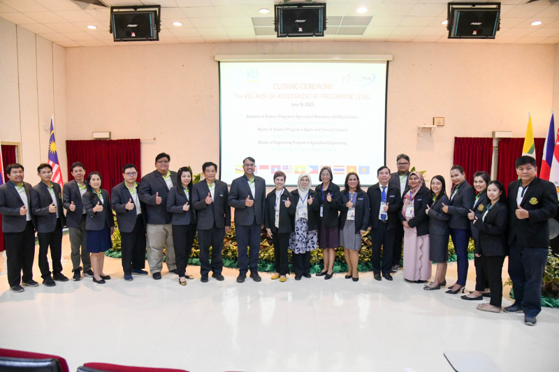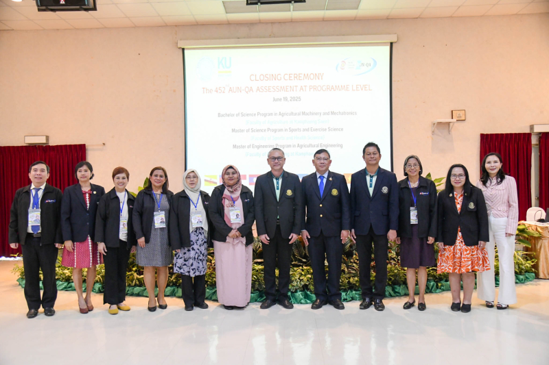 วันพฤหัสบดีที่ 19 มิถุนายน 2568 ผู้ช่วยศาสตราจารย์ ดร.ชัยสิทธิ์ ทองจู คณบดีคณะเกษตร กำแพงแสน พร้อมด้วยคณะผู้บริหารคณะฯ และคณาจารย์ ร่วมรับฟังการนำเสนอผลการประเมินเบื้องต้น จากผู้ประเมินคุณภาพการศึกษาภายนอก ระดับหลักสูตร ภายใต้โครงการ “The 452nd AUN-QA Programme Assessment at Kasetsart University, Kamphaeng Saen Campus” ระดับอาเซียน และพิธีปิดโครงการประเมินฯ ตัวแทนคณะกรรมการประเมิน ตัวแทนจากมหาวิทยาลัย ถ่ายภาพหมู่ร่วมกัน สรุปผลการประเมินของคณะกรรมการผู้ประเมิน ณ ห้องเธียเตอร์ ชั้น 1 อาคารศูนย์มหาวิทยาลัยเกษตรศาสตร์ วิทยาเขตกำแพงแสน