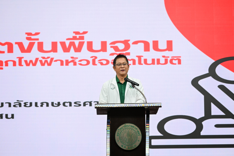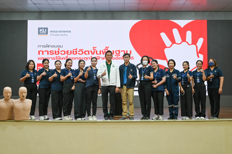 วันศุกร์ที่ 20 มิถุนายน 2568 คณะเกษตร กำแพงแสน จัดโครงการพัฒนาทักษะการคิดและการเรียนรู้ กิจกรรมฝึกอบรม "การช่วยชีวิตขั้นพื้นฐานและการใช้เครื่องกระตุกไฟฟ้าหัวใจอัตโนมัติ" โดย ผู้ช่วยศาสตราจารย์ ดร.ชัยสิทธิ์ ทองจู คณบดีคณะเกษตร กำแพงแสน กล่าวเปิดโครงการ ฝึกอบรมโดยวิทยากรจาก โรงพยาบาลกรุงเทพสนามจันทร์ บรรยายให้ความรู้เรื่องการช่วยชีวิตขั้นพื้นฐานสำหรับประชาชนทั่วไป (BLS -Basic life support for citizen) ปฏิบัติการช่วยฟื้นชีวิต (CPR - Cardiopulmonany resuscitation) โดยฝึกปฏิบัติ การช่วยเหลือในภาวะสำลักและทางเดินลมหายใจอุดกั้น (Choking) การใช้เครื่องช็อกไฟฟ้าหัวใจอัตโนมัติ (AED - Automatic extemaldefibrillator) สำหรับประชาชน ณ ห้องคอนเวนชั่น อาคารศูนย์มหาวิทยาลัยเกษตรศาสตร์ วิทยาเขตกำแพงแสน