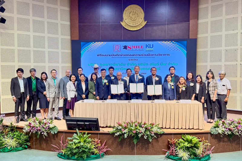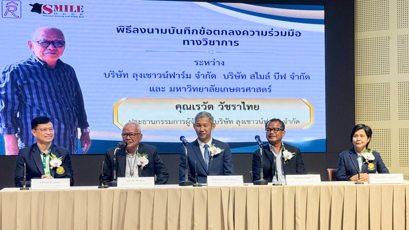 วันพุธที่ 3 กันยายน 2568 คณบดีคณะเกษตร กำแพงแสน มอบหมายให้ รองศาสตราจารย์.ดร.ยุวเรศ เรืองพานิช หัวหน้าภาควิชาสัตวบาล เป็นผู้แทนเข้าร่วมพิธีลงนาม ใน "บันทึกข้อตกลงความร่วมมือทางวิชาการด้านการผลิตและปรับปรุงพันธุ์โคเนื้อไทย" ระหว่าง มหาวิทยาลัยเกษตรศาสตร์ บริษัท ลุงเชาวน์ฟาร์ม จำกัด และ บริษัท สไมล์ บีฟ จำกัด เพื่อร่วมกันในการพัฒนาความร่วมมือทางวิชาการ บูรณาการองค์ความรู้ เทคโนโลยี และทรัพยากรจากทุกภาคส่วนด้านการผลิตโคเนื้อ เพื่อสร้างความมั่นคงทางอาหารของประเทศ อีกทั้งยังเป็นแนวทางหนึ่งในการลดการพึ่งพาการนำเข้าจากต่างประเทศ และเป็นการยกระดับศักยภาพการแข่งขันของอุตสาหกรรมโคเนื้อไทยสู่มาตรฐานสากล ในการลงนามครั้งนี้มี ผู้ช่วยศาสตราจารย์ น.สพ.ดร.คงศักดิ์ เที่ยงธรรม รองอธิการบดีฝ่ายวิชาการและการเรียนรู้ตลอดชีวิต เป็นผู้แทน รักษาการแทนอธิการบดี มหาวิทยาเกษตรศาสตร์ ศาสตราจารย์ ดร.ดอกรัก มารอด รองอธิการบดีฝ่ายวิจัยและความเป็นสากล และ รองศาสตราจารย์ ดร.พัชรียา บุญกอแก้ว คณบดีคณะเกษตร เป็นพยาน รวมทั้งมีผู้บริหารของ บริษัท ลุงเชาวน์ฟาร์ม จำกัด ประกอบด้วย คุณเรวัต วัชราไทย และทีมงาน และผู้บริหารของ บริษัท สไมล์ บีฟ จำกัด ประกอบด้วย คุณสานน กันรัมย์ และทีมงาน ร่วมลงนาม โดยมี รองศาสตราจารย์ ดร.ธนาทิพย์ สุวรรณโสภี รองคณบดีคณะเกษตร ฝ่ายบริหาร และ ผู้ช่วยศาสตราจารย์ ดร.พนามาศ ตรีวรรณ รองคณบดีคณะเกษตร ฝ่ายบริการวิชาการ เป็นผู้ดำเนินงานและประสานงาน อีกทั้งยังมี คณะผู้บริหาร คณาจารย์ และนิสิตมหาวิทยาลัยเกษตรศาสตร์ รวมทั้งสื่อมวลชน และบุคคลจากทุกภาคส่วนที่เกี่ยวข้องร่วมในพิธี ณ ห้องประชุมรวงข้าว อาคารวชิรานุสรณ์ คณะเกษตร