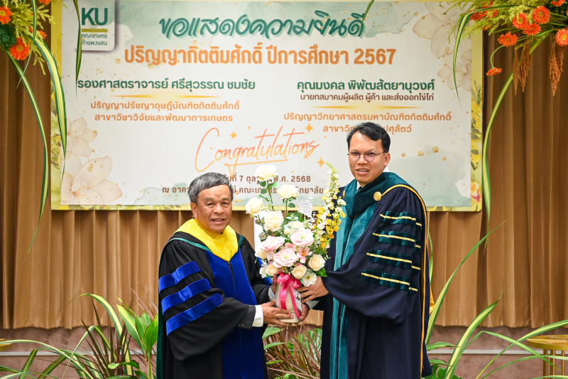โดย ผู้ช่วยศาสตราจารย์ ดร. ชัยสิทธิ์ ทองจู คณบดีคณะเกษตร กำแพงแสน กล่าวขอบคุณ และแสดงความยินดี พร้อมมอบช่อดอกไม้ ให้แก่ทั้ง 2 ท่าน ได้มีผู้บริหารและผู้แทนจากภาครัฐและเอกชน ร่วมแสดงความยินดีกับทั้ง 2 ท่าน อย่างอบอุ่น ณ อาคารวชิรานุสรณ์ คณะเกษตร มหาวิทยาลัยเกษตรศาสตร์ บางเขน