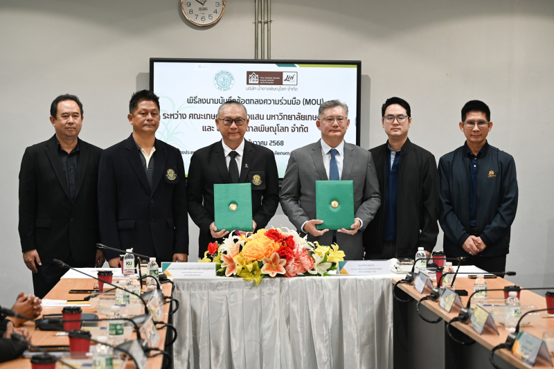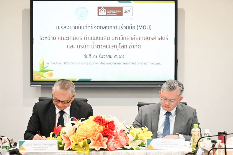 วันอังคารที่ 23 ธันวาคม 2568 คณะเกษตร กำแพงแสน ได้ดำเนินการจัดพิธีลงนามบันทึกข้อตกลงความร่วมมือ (MOU) ระหว่าง คณะเกษตร กำแพงแสน กับ บริษัท น้ำตาลพิษณุโลก จำกัด โดย รองศาสตราจารย์ นายสัตวแพทย์ ดร.อนุชัย ภิญโญภูมิมินทร์ รองอธิการบดีวิทยาเขตกำแพงแสน และ คุณเอกรัตน์ เตชะเวช รองกรรมการผู้จัดการสายงานผลิตและจัดหาวัตถุดิบ บริษัท น้ำตาลพิษณุโลก จำกัด เป็นผู้ลงนาม พร้อมด้วย ผู้ช่วยศาสตราจารย์ ดร.ชัยสิทธิ์ ทองจู คณบดีคณะเกษตร กำแพงแสน รองศาสตราจารย์ ดร.ชเนษฎ์ ม้าลำพอง รองคณบดีฝ่ายวิจัยและบริการวิชาการเพื่อความเป็นสากล คุณสมิทธิ ว่องไพฑูรย์ ผู้จัดการอาวุโสลูกค้าสัมพันธ์และความยั่งยืน และคุณกันต์ ธนพุฒิพันธุ์ ผู้จัดการอาวุโสฝ่ายบุคคล บริษัท น้ำตาลพิษณุโลก จำกัด ร่วมเป็นพยานในการลงนาม ทั้งยังมีคณาจารย์ บุคลากร ผู้บริหาร และเจ้าหน้าที่ ของทั้ง 2 ฝ่าย ร่วมในพิธี ณ ห้องประชุม 306 อาคารหลวงสุวรรณวาจกกสิกิจ มหาวิทยาลัยเกษตรศาสตร์ วิทยาเขตกำแพงแสน