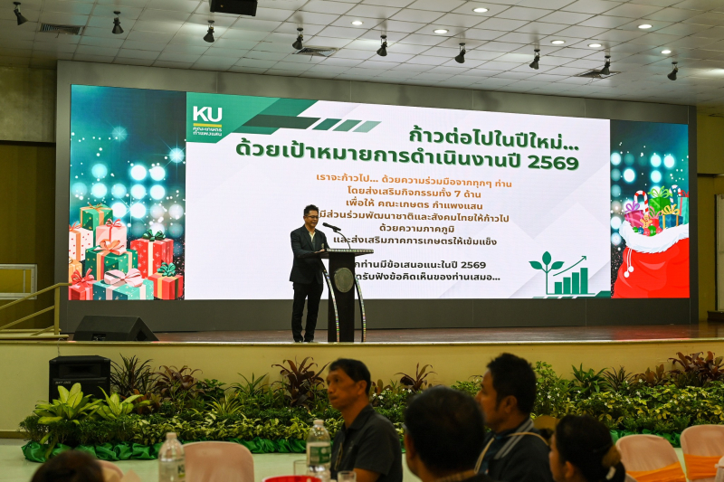 วันอังคารที่ 23 ธันวาคม 2568 คณะเกษตร กำแพงแสน จัดกิจกรรม “ร้อยดวงใจ สู่ความสุขสดใส ประจำปี 2569" ภายใต้โครงการสร้างวัฒนธรรมและค่านิยมของบุคลากร คณะเกษตร กำแพงแสน ก่อนเริ่มงาน มีกิจกรรมเสริมสร้างวัฒนธรรมและค่านิยมของบุคลากร (สันทนาการ) ผู้ช่วยศาสตราจารย์ ดร.ชัยสิทธิ์ ทองจู คณบดีคณะเกษตร กำแพงแสน เป็นประธานกล่าวเปิดงาน ขอบคุณบุคลากร และอวยพรเนื่องในโอกาสปีใหม่ 2568 ร่วมชมวีดีทัศน์ “กิจกรรมและการดำเนินงานต่างๆ ของคณะเกษตร กำแพงแสน ตลอด ปี 2568 ที่ผ่านมา กิจกรรมแนะนำบุคลากรใหม่ การจับฉลากมอบของขวัญ และรับประทานอาหารร่วมกัน ณ ห้องคอนเวนชั่น อาคารศูนย์มหาวิทยาลัยเกษตรศาสตร์ วิทยาเขตกำแพงแสน