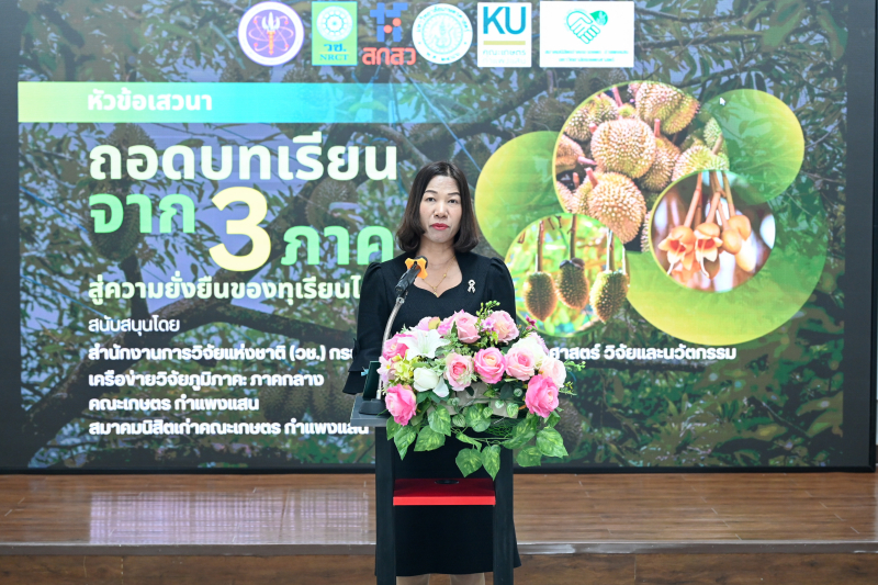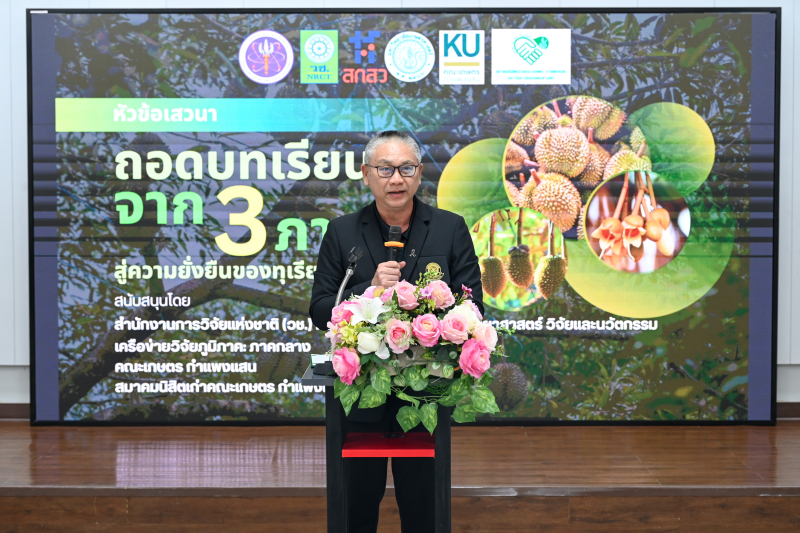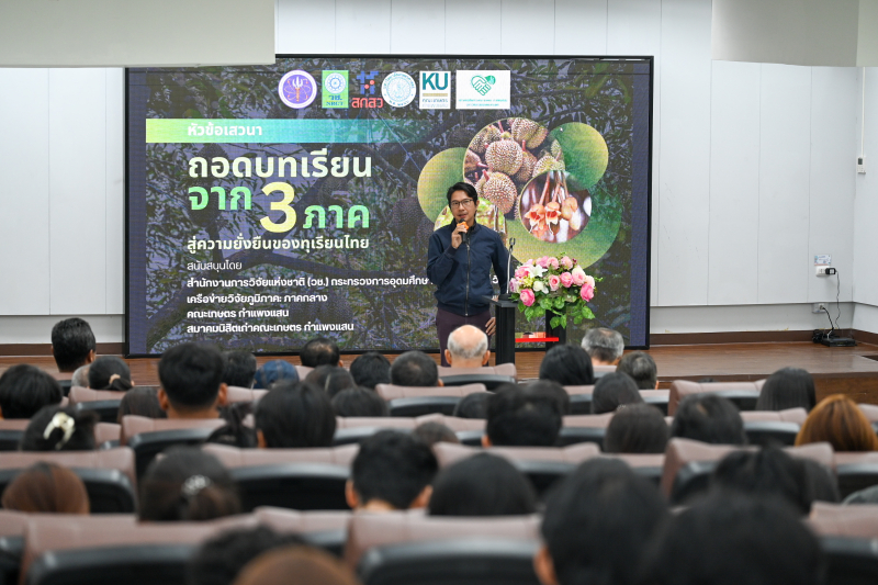 สำนักงานการวิจัยแห่งชาติ (วช.) ร่วมกับเครือข่ายวิจัยภูมิภาค: ภาคกลาง คณะเกษตร กำแพงแสน และสมาคมนิสิตเก่าคณะเกษตร กำแพงแสน จัดเวทีเสวนา “ถอดบทเรียนจาก 3 ภาค สู่ความยั่งยืนของทุเรียนไทย” เมื่อวันที่ 8 ธันวาคม 2568 ณ อาคาร 80 ปี มหาวิทยาลัยเกษตรศาสตร์ ภายใต้โครงการ “ศูนย์เรียนรู้การผลิตทุเรียนภาคตะวันตก” โดย รศ.ดร.เกียรติสุดา เหลืองวิลัย เป็นหัวหน้าโครงการ และคณาจารย์จากคณะเกษตร กำแพงแสนเป็นผู้ร่วมวิจัย