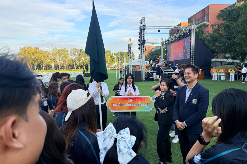 วันพุธที่ 10 ธันวาคม 2568 ผู้ช่วยศาสตราจารย์ ดร. ชัยสิทธิ์ ทองจู คณบดีคณะเกษตร กำแพงแสน กล่าวให้กำลังใจนิสิตตัวแทนคณะเกษตร กำแพงแสน จำนวน 42 คน ที่ได้รับการคัดเลือกเพื่อร่วมแข่งขันกีฬาทักษะทางการเกษตร ในงานประเพณี 4 จอบแห่งชาติ ครั้งที่ 40 "เยือนถิ่นยูงทอง ผองเราน้องพี่ เกษตรสามัคคี 40 ปี 4 จอบ" วันที่ 10-14 ธันวาคม 2568 ณ คณะวิทยาศาสตร์และเทคโนโลยี มหาวิทยาลัยธรรมศาสตร์ ศูนย์รังสิต โดยมีคณาจารย์คณะเกษตร กำแพงแสน ร่วมเป็นกรรมการตัดสินกีฬาทักษะการเกษตรประเภทต่างๆ