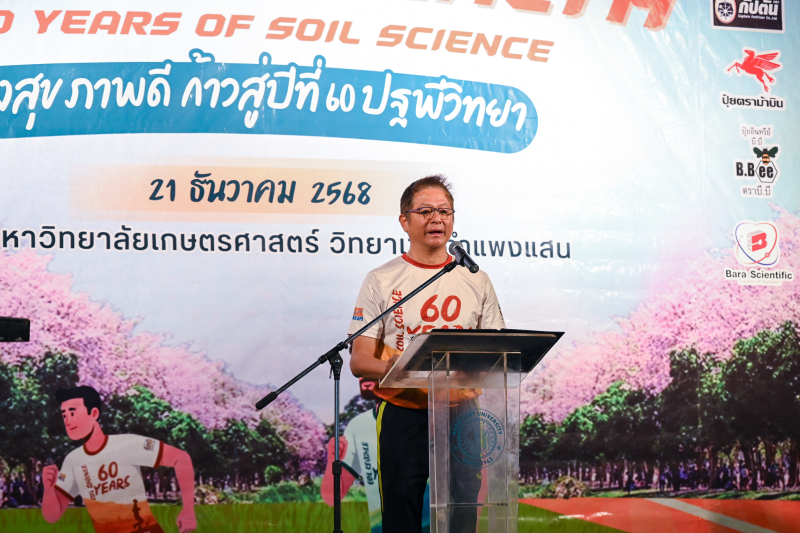 ผู้ช่วยศาสตราจารย์ ดร.ชัยสิทธิ์ ทองจู คณบดีคณะเกษตร กำแพงแสน เป็นประธานกล่าวเปิดงานกิจกรรม "Run for Health :60 years of Soil Science วิ่งสุขภาพดี ก้าวสู่ปีที่ 60 ปฐพีวิทยา ในวันอาทิตย์ที่ 21 ธันวาคม 2568 ณ บริเสณสระพระพิรุณ มหาวิทยาลัยเกษตรศาสตร์ วิทยาเขตกำแพงแสน โดยมี ผู้ช่วยศาสตราจารย์ ดร.ธวัชชัย อินทร์บุญช่วย หัวหน้าภาควิชาปฐพีวิทยา คณะเกษตร กำแพงแสน เป็นตัวแทนภาควิชาปฐพีวิทยา มหาวิทยาลัยเกษตรศาสตร์ กล่าวรายงานวัตถุประสงค์ของการจัดงาน ได้รับเกียรติจาก รองศาสตราจารย์ ดร.วิโรจน์ อิ่มพิทักษ์ อธิการบดีมหาวิทยาลัยเกษตรศาสตร์ คนที่ 13 และนายกสภามหาวิทยาลัยเกษตรศาสตร์ คนที่ 28 ศาสตราจารย์พิเศษ ดร.ยงยุทธ โอสถสภา อดีตรองอธิการบดีประจำวิทยาเขตกำแพงแสน รองศาสตราจารย์ ดร.พัชรียา บุญกอแก้ว คณบดีคณะเกษตร รองศาสตราจารย์ ดร.กรรณิการ์ สัจจาพันธ์ หัวหน้าภาควิชาปฐพีวิทยา คณะเกษตร พร้อมด้วยผู้บริหารหน่วยงานต่างๆ และอดีตหัวหน้าภาควิชาปฐพีวิทยาทั้งสองวิทยาเขต ร่วมในพิธีเปิด ปล่อยตัวนักกีฬา ร่วมเดิน -วิ่ง ระยะ 3 กิโลเมตร และให้เกียรติมอบรางวัลแก่ผู้ชนะการแข่งขันประเภทต่างๆ