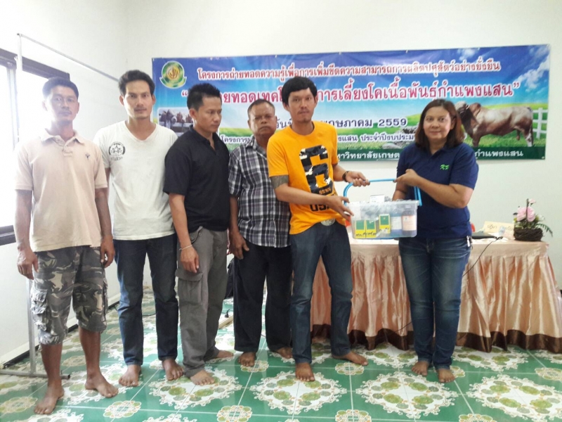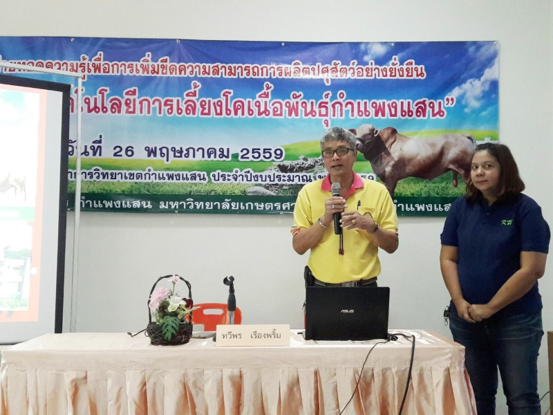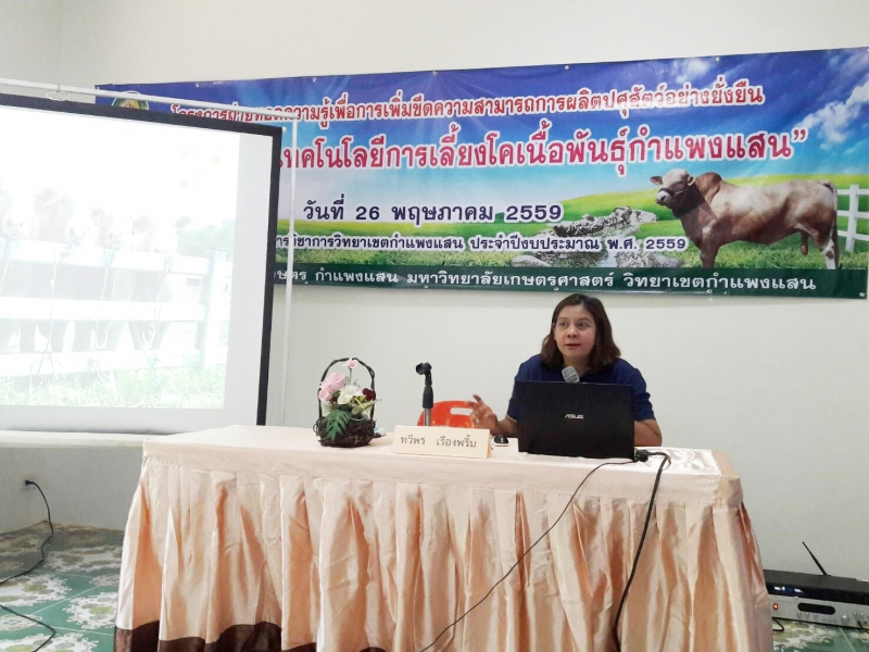 วันที่ 26 พฤษภาคม 2559 ภาควิชาสัตวบาล คณะเกษตร กำแพงแสน ดำเนินกิจกรรม การถ่ายทอดเทคโนโลยีการเลี้ยงโคเนื้อพันธุ์กำแพงแสน ภายใต้โครงการถ่ายทอดองค์ความรู้เพื่อเพิ่มขีดความสามารถการผลิตปศุสัตว์อย่างยั่งยืน ซึ่งเป็นโครงการบริการวิชาการวิทยาเขตกำแพงแสน ประจำปีการศึกษา พ.ศ. 2559 ให้แก่เกษตรกรและผู้สนใจจำนวน 30 คน