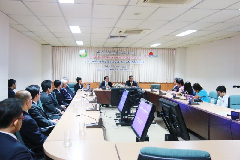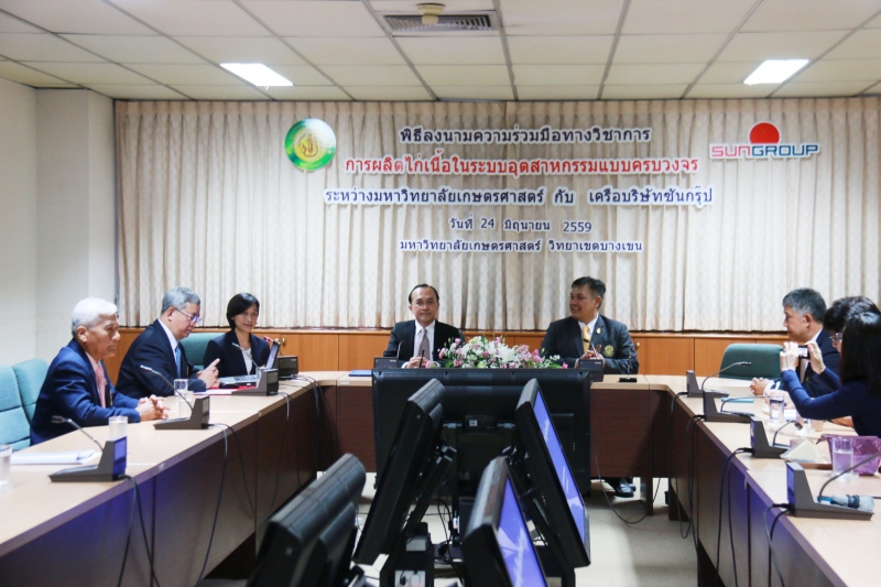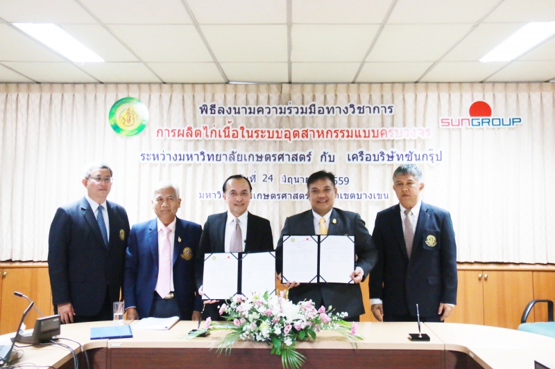 มหาวิทยาลัยเกษตรศาสตร์ และ เครือบริษัท ซันกรุ๊ป ตระหนักถึงประโยชน์และความสำคัญของการร่วมมือระหว่างสถาบันการศึกษาและบริษัทธุรกิจเอกชน ในด้านการศึกษาการบริหารจัดการองค์ความรู้ที่เกี่ยวข้องกับอุตสาหกรรมการเลี้ยงไก่เนื้อระบบอุตสาหกรรมแบบครบวงจร จึงได้มีการทำพิธีลงนามบันทึกข้อตกลงความร่วมมือ การผลิตไก่เนื้อในระบบอุตสาหกรรมแบบครบวงจร ในวันที่ 24 มิถุนายน 2559 โดยมี ผู้ช่วยศาสตราจารย์ ดร.เสกสม อาตมางกูร คณบดีคณะเกษตร กำแพงแสน กล่าวต้อนรับและแนะนำภารกิจของหน่วยงาน และได้รับเกียรติจาก ดร.จงรัก วัชรินทร์รัตน์ รักษาการแทนอธิการบดีมหาวิทยาลัยเกษตรศาสตร์ กล่าวเปิดพิธี และร่วมลงนามบันทึกข้อตกลงความร่วมมือ ร่วมกับ คุณจำลอง เติมกลิ่นจันทน์ ประธานเจ้าหน้าที่บริหาร บริษัทในเครือซันกรุ๊ป ผู้มีอำนาจลงนาม โดยมีผู้ทรงคุณวุฒิ คณะผู้บริหารและบุคลากรของคณะเกษตร กำแพงแสน คณะผู้บริหารและเจ้าหน้าที่ เครือบริษัท ซันกรุ๊ป และสื่อมวลชน ร่วมเป็นสักขีพยาน ณ ห้องประชุม 8 ชั้น 2 อาคารสารนิเทศ 50 ปี มหาวิทยาลัยเกษตรศาสตร์ บางเขน กรุงเทพมหานคร