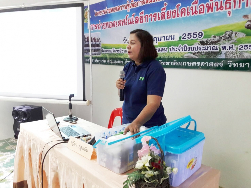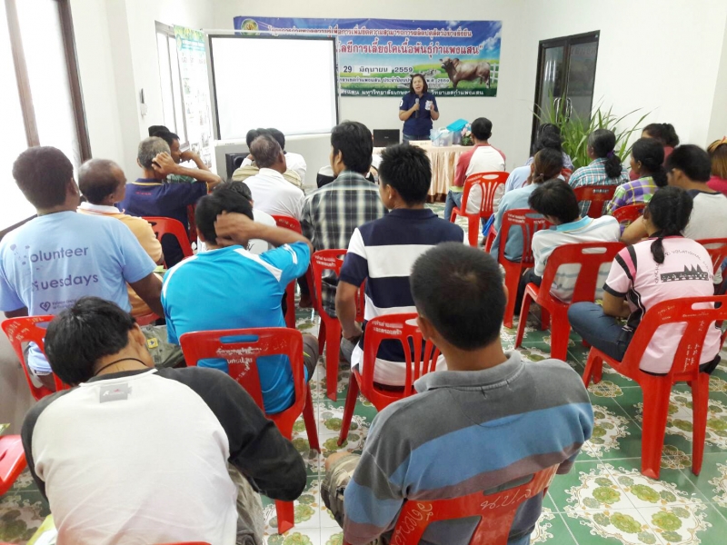 วันที่ 29 มิถุนายน 2559 ภาควิชาสัตวบาล คณะเกษตร กำแพงแสน ดำเนินกิจกรรม การถ่ายทอดเทคโนโลยีการเลี้ยงโคเนื้อพันธุ์กำแพงแสน ภายใต้โครงการถ่ายทอดองค์ความรู้เพื่อเพิ่มขีดความสามารถการผลิตปศุสัตว์อย่างยั่งยืน ซึ่งเป็นโครงการบริการวิชาการวิทยาเขตกำแพงแสน ประจำปีการศึกษา พ.ศ. 2559 ให้แก่เกษตรกรผู้เลี้ยงโค ในจังหวัดนครปฐม จำนวน 30 คน