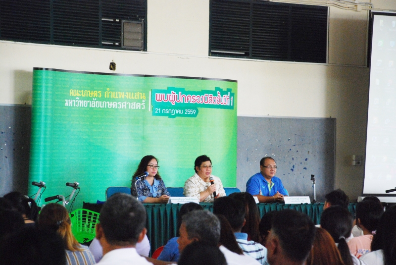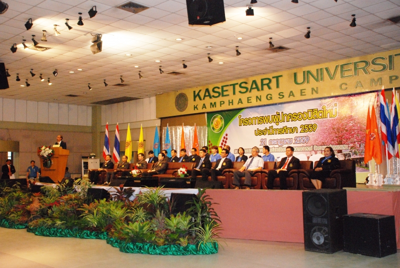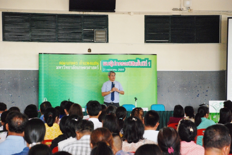 วันที่ 21 กรกฎาคม 2559 มหาวิทยาลัยเกษตรศาสตร์ วิทยาเขตกำแพงแสน จัดโครงการพบผู้ปกครองนิสิตใหม่ ปีการศึกษา 2559 โดย รองศาสตราจารย์ ดร. ตฤณ แสงสุวรรณ รักษาการแทนรองอธิการบดี มหาวิทยาลัยเกษตรศาสตร์ วิทยาเขตกำแพงแสน กล่าวต้อนรับผู้ปกครองนิสิตใหม่ และมีการอภิปรายหัวข้อ บทบาทมหาวิทยาลัยและผู้ปกครอง ต่อการศึกษา และการดำเนินชีวิตของนิสิต ณ ห้องคอนเวนชั่น อาคารศูนย์มหาวิทยาลัยเกษตรศาสตร์ วิทยาเขตกำแพงแสน จากนั้นเป็นการพบผู้ปกครองระดับคณะ ซึ่งคณะเกษตร กำแพงแสน จัดให้มีการชมวีดิทัศน์แนะนำคณะฯ พิธีกรแนะนำผู้บริหารและคณาจารย์คณะฯ ผศ.ดร.เสกสม อาตมางกูร คณบดีคณะเกษตร กำแพงแสน กล่าวต้อนรับผู้ปกครองนิสิตใหม่ จากนั้น เป็นการร่วมกันชี้แจงและสร้างความเข้าใจในการเรียนการสอน โครงการแลกเปลี่ยนระหว่างประเทศ และกิจกรรมนิสิต เพื่อเสริมสร้างความรู้ความเข้าใจให้ท่านผู้ปกครองทราบถึงกระบวนการเรียนรู้ การดำรงชีวิตของนิสิตคณะเกษตร กำแพงแสน และตอบข้อซักถาม โดย ผศ.ดร.สิรินทร์พร สินธุวณิชย์ รองคณบดีฝ่ายการศึกษา ผศ.ดร.สุกัญญา รัตนทับทิมทอง รองคณบดีฝ่ายวิเทศสัมพันธ์ และ อาจารย์ ดร.ปิยะณัฎฐ์ ผกามาศ รองคณบดีฝ่ายกิจการนิสิต และมอบของที่ระลึกให้แก่ผู้ปกครองนิสิตใหม่ที่เข้าร่วมโครงการในครั้งนี้ จำนวนกว่า 400 คน