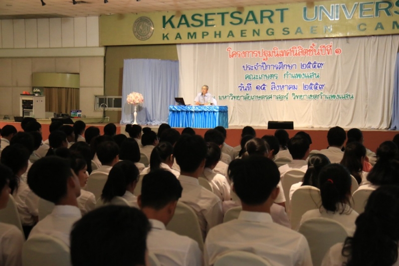 วันที่ 15 สิงหาคม 2559 คณะเกษตร กำแพงแสน จัดโครงการปฐมนิเทศนิสิตชั้นปีที่ 1 ประจำปีการศึกษา 2559 มีการแนะนำคณาจารย์ประจำภาควิชาต่างๆ จากนั้น ผศ.ดร.เสกสม อาตมางกูร คณบดีคณะเกษตร กำแพงแสน กล่าวเปิดโครงการและบรรยายพิเศษ การแนะนำแนวทางและแผนการศึกษา โดย ผศ.ดร.สิรินทร์พร สินธุวณิชย์ รองคณบดีฝ่ายการศึกษา แนะนำโครงการกิจกรรมนิสิต และกฎระเบียบสำหรับนิสิต โดย อ.ดร. ปิยะณัฏฐ์ ผกามาศ รองคณบดีฝ่ายกิจการนิสิต และ แนะนำโครงการแลกเปลี่ยนกับต่างประเทศ โดย นางสาวลลิดา มะศิริ เจ้าหน้าที่ฝ่ายวิเทศสัมพันธ์