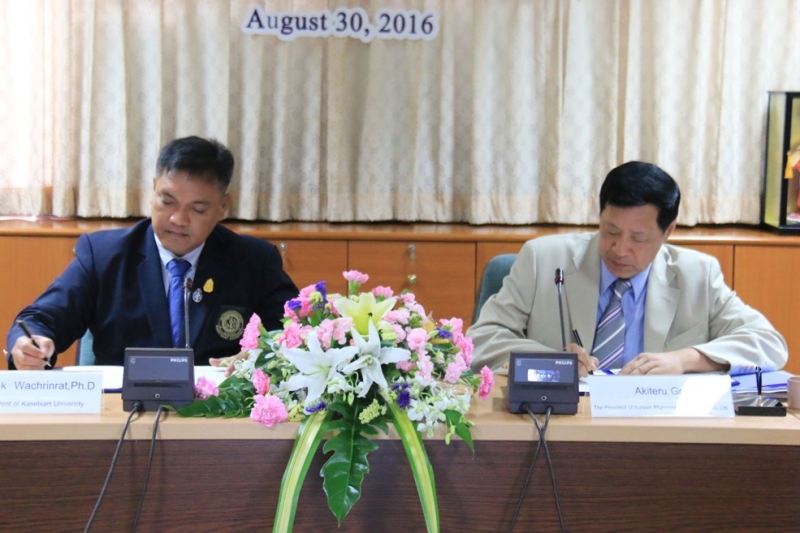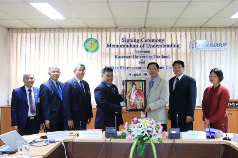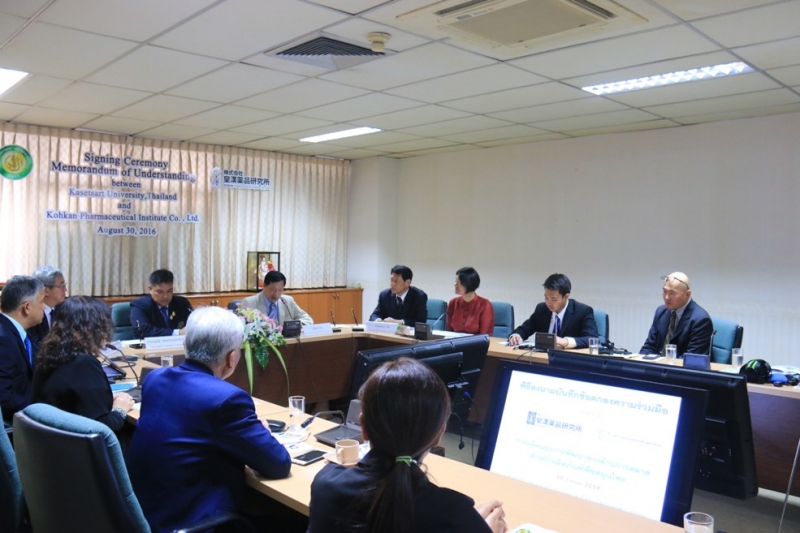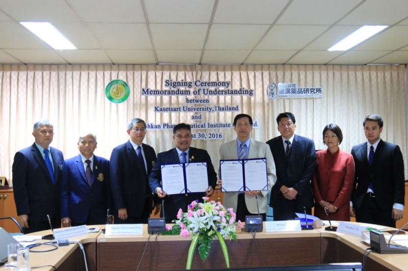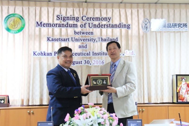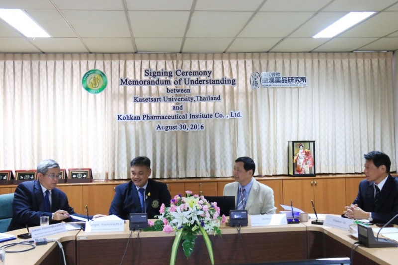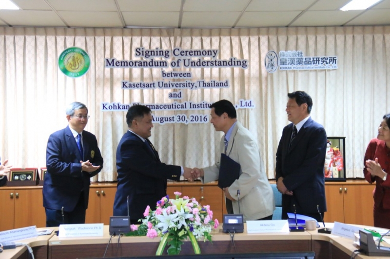 วันที่ 30 สิงหาคม พ.ศ.2559 จึงได้มีการจัดพิธีลงนามบันทึกข้อตกลงความร่วมมือระหว่างมหาวิทยาลัยเกษตรศาสตร์ ในนามคณะเกษตร กำแพงแสน และ บริษัท โคคัน ฟาร์มาซูติคอล อินสติติวท์ จำกัด เพื่อผลิตและจัดส่งวัตถุดิบสมุนไพรใน การผลิตผลิตภัณฑ์สมุนไพรของบริษัทเป็นหลัก โดย รองศาสตราจารย์ ดร. เนรมิตร สุขมณี หัวหน้าภาควิชาสัตวบาล คณะเกษตร กำแพงแสน กล่าวรายงาน ผู้ช่วยศาสตราจารย์ ดร.เสกสม อาตมางกูร คณบดีคณะเกษตร กำแพงแสน กล่าวต้อนรับ และแนะนำภารกิจของสถานที่ผลิตยาสมุนไพร และ Mr. Amiteru Go ประธาน บริษัท โคคัน ฟาร์มาซูติคอล อินสติติวท์ จำกัด กล่าวถึงนโยบาย และความร่วมมือกับทางมหาวิทยาลัยเกษตรศาสตร์ จากนั้น ได้ลงนามบันทึกข้อตกลงร่วมกัน โดยผู้มีอำนาจลงนาม ได้แก่ ดร.จงรัก วัชรินทร์รัตน์ รักษาการแทนอธิการบดีมหาวิทยาลัยเกษตรศาสตร์ Mr. Amiteru Go ประธานและผู้แทน บริษัท โคคัน ฟาร์มาซูติคอล อินสติติวท์ จำกัด ผู้ช่วยศาสตราจารย์ ดร.เสกสม อาตมางกูร คณบดีคณะเกษตร กำแพงแสน และ Mr. Shigekuni Go รองประธานและผู้แทน บริษัท โคคัน ฟาร์มาซูติคอล อินสติติวท์ จำกัดโดยมีผู้ทรงคุณวุฒิ คณะผู้บริหารและบุคลากรของคณะเกษตร กำแพงแสน คณะผู้บริหารและเจ้าหน้าที่ บริษัท โคคัน ฟาร์มาซูติคอล อินสติติวท์ จำกัด และสื่อมวลชน ร่วมเป็นสักขีพยาน เมื่อเสร็จสิ้นพิธี ดร.จงรัก วัชรินทร์รัตน์ รักษาการแทนอธิการบดีมหาวิทยาลัยเกษตรศาสตร์ ได้กล่าวแสดงความยินดี แลกเปลี่ยนบันทึกข้อตกลงความร่วมมือ และถ่ายรูปร่วมกัน จากนั้นได้ประชุมแนวทางการทำงานร่วมกันเพื่อบรรลุข้อตกลงความร่วมมือ