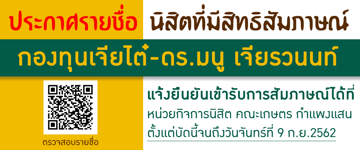 พัฒนาระบบโดย : น.ส.ดวงกมล ด้วงจุมพล หน่วยผลิตสื่อและเทคโนโลยีสารสนเทศ คณะเกษตร กำแพงแสน