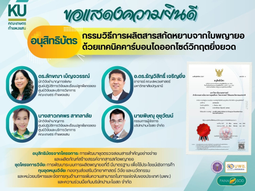 อนุสิทธิบัตร "กรรมวิธีการผลิตสารสกัดหยาบจากใบพญายอ ด้วยเทคนิคคาร์บอนไดออกไซด์วิกฤตยิ่งยวด”