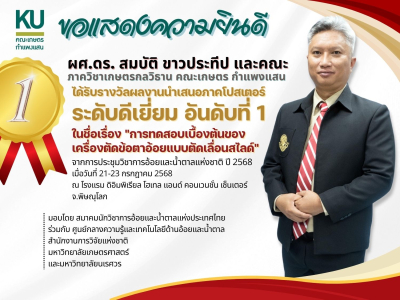 รางวัลผลงานนำเสนอภาคโปสเตอร์ ระดับดีเยี่ยม อันดับที่ 1 จากการประชุมวิชาการอ้อยและน้ำตาลแห่งชาติ ปี68