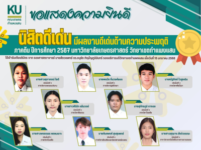 รางวัล “นิสิตดีเด่น” มีผลงานดีเด่นด้านความประพฤติ ประจำภาคต้น ปีการศึกษา 2567 มก.กพส.
