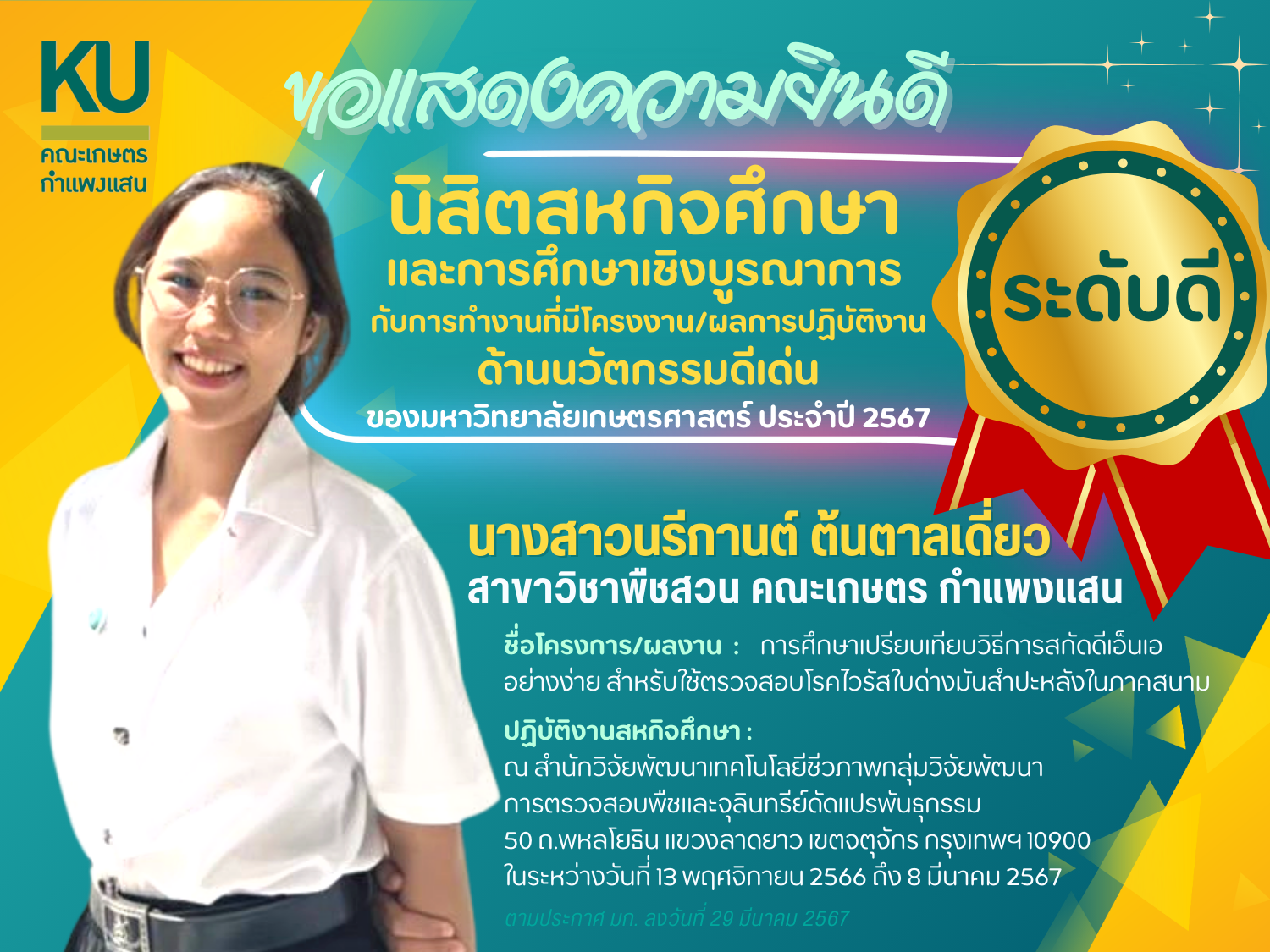 นิสิตสหกิจศึกษาฯ ด้านวิทยาศาสตร์และเทคโนโลยีดีเด่น ของ มก. ประจำปี 2567 "ระดับดี"